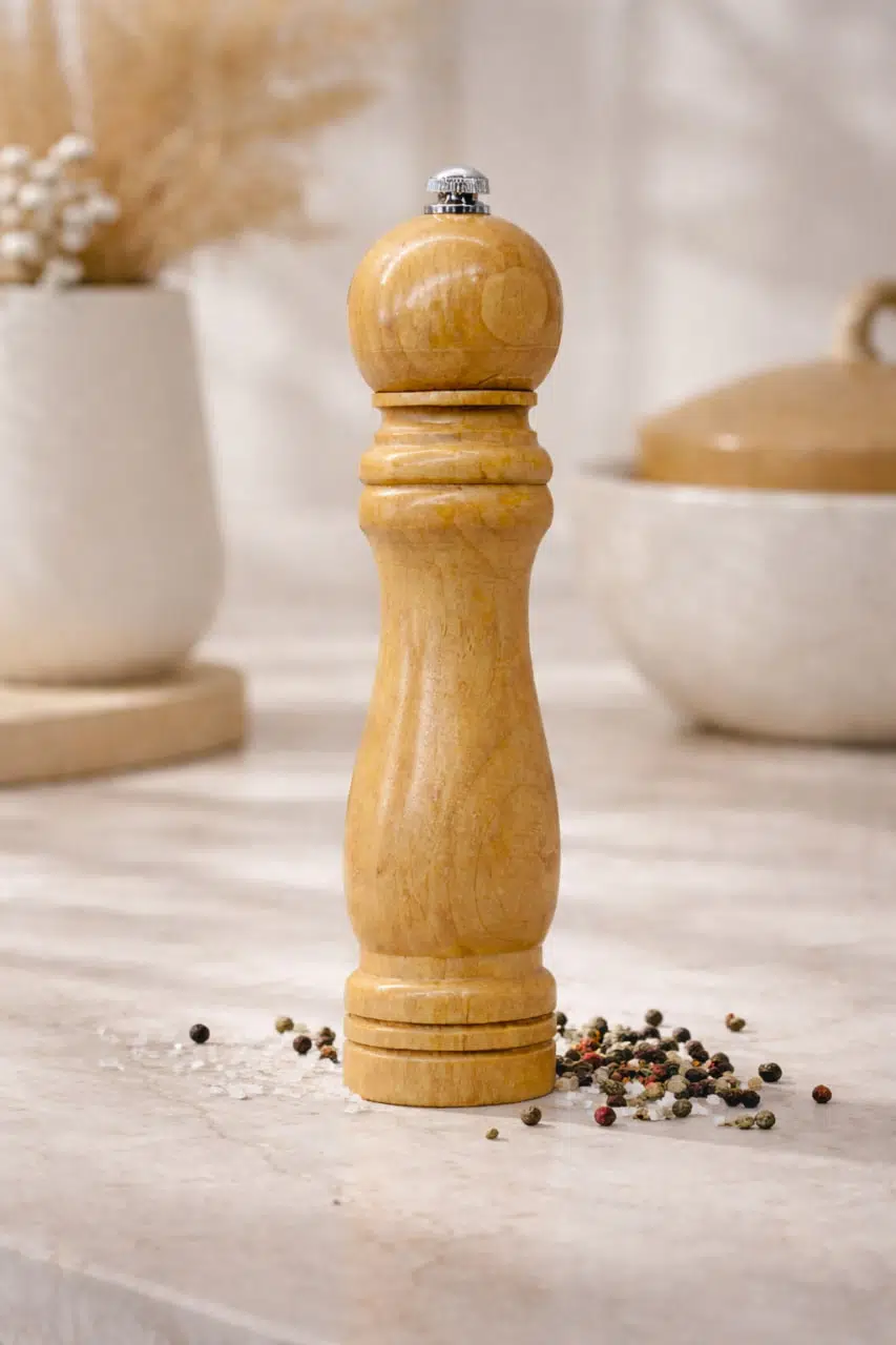 Ahşap tuz karabiber değirmeni, sağlıklı, doğal ve çevre dostu malzemelerden üretilmiştir. Güçlü mekanizması sayesinde baharatları ezmeden, ideal kıvamda öğütür. Hem günlük kullanım hem de misafir sofraları için ideal bir tercihtir.