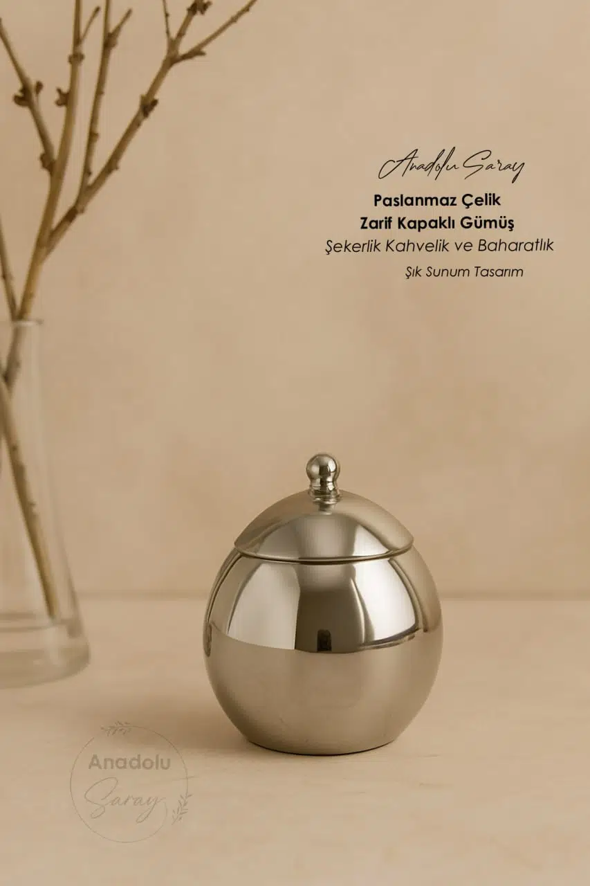 Mutfağınızda estetiği ve dayanıklılığı bir araya getiren 0,80 MM kalınlığında paslanmaz çelik zarif kapaklı gümüş şekerlik, kahvelik ve baharatlık, modern ve şık tasarımıyla sofralarınıza zarafet katar.
