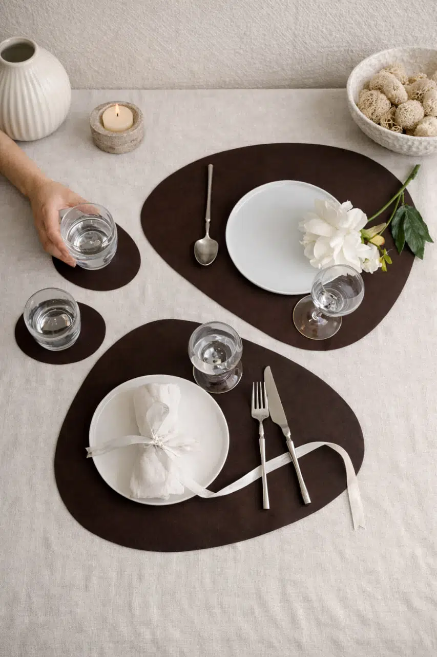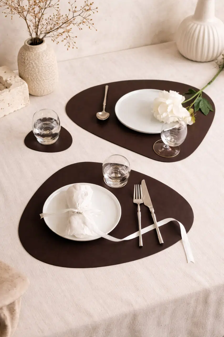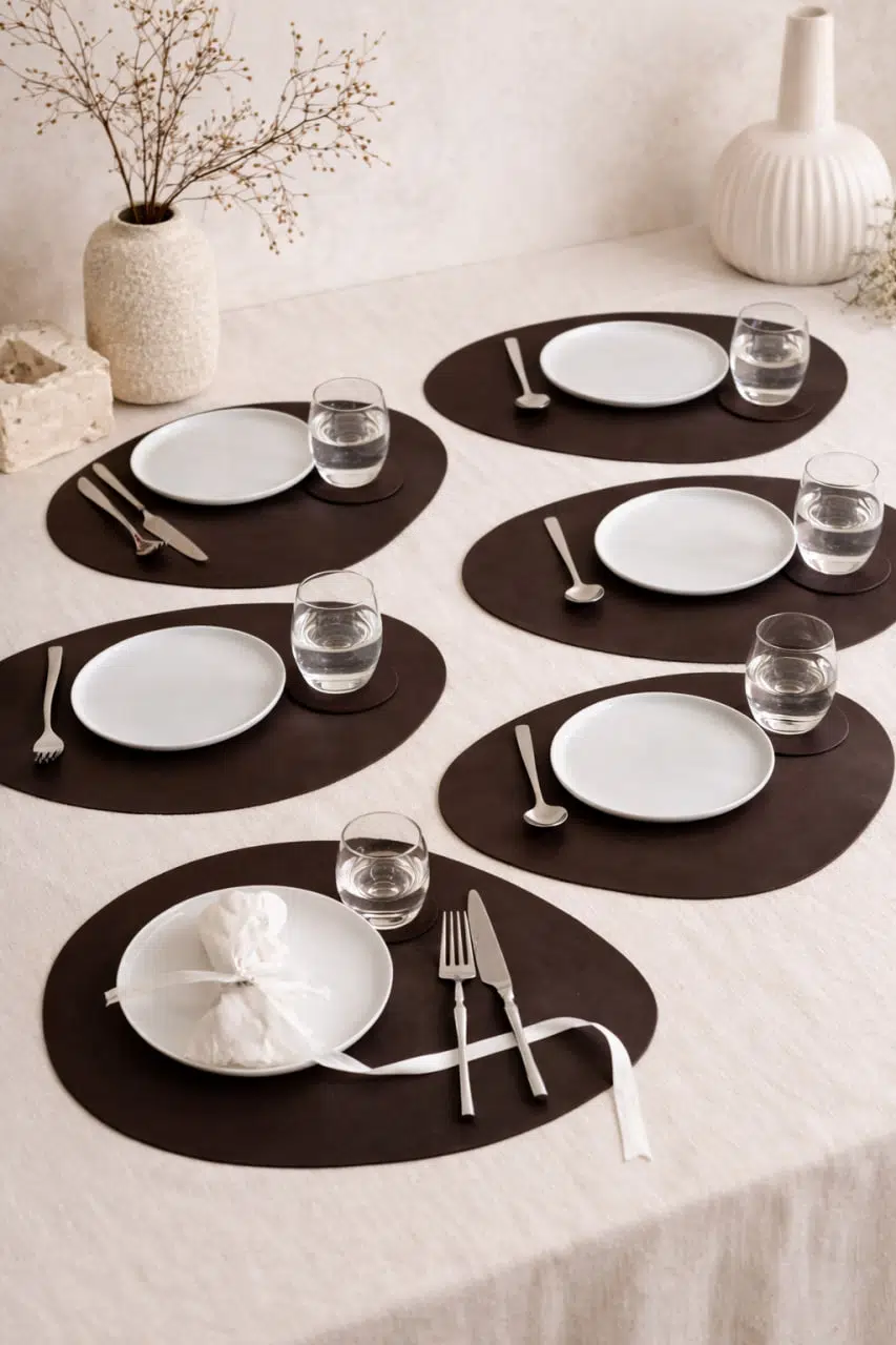 Modern sofralar için tasarlanmış Koyu Kahve Deri Asimetrik Supla ve Bardak Altlığı Seti, zarif ve minimal tasarımıyla sofranıza estetik bir dokunuş kazandırır.