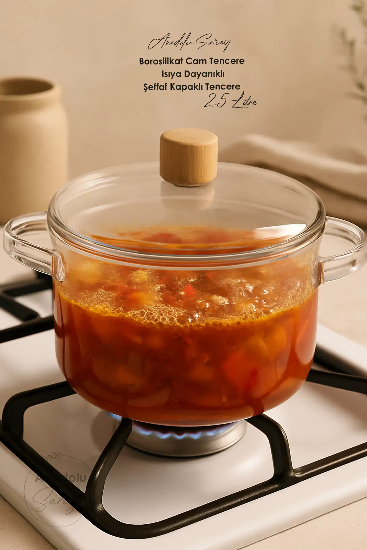 2.5 litre hacme sahip borosilikat cam tencere, yüksek ısıya dayanıklı yapısıyla hem ocak üzerinde hem de fırında güvenle kullanılabilir.