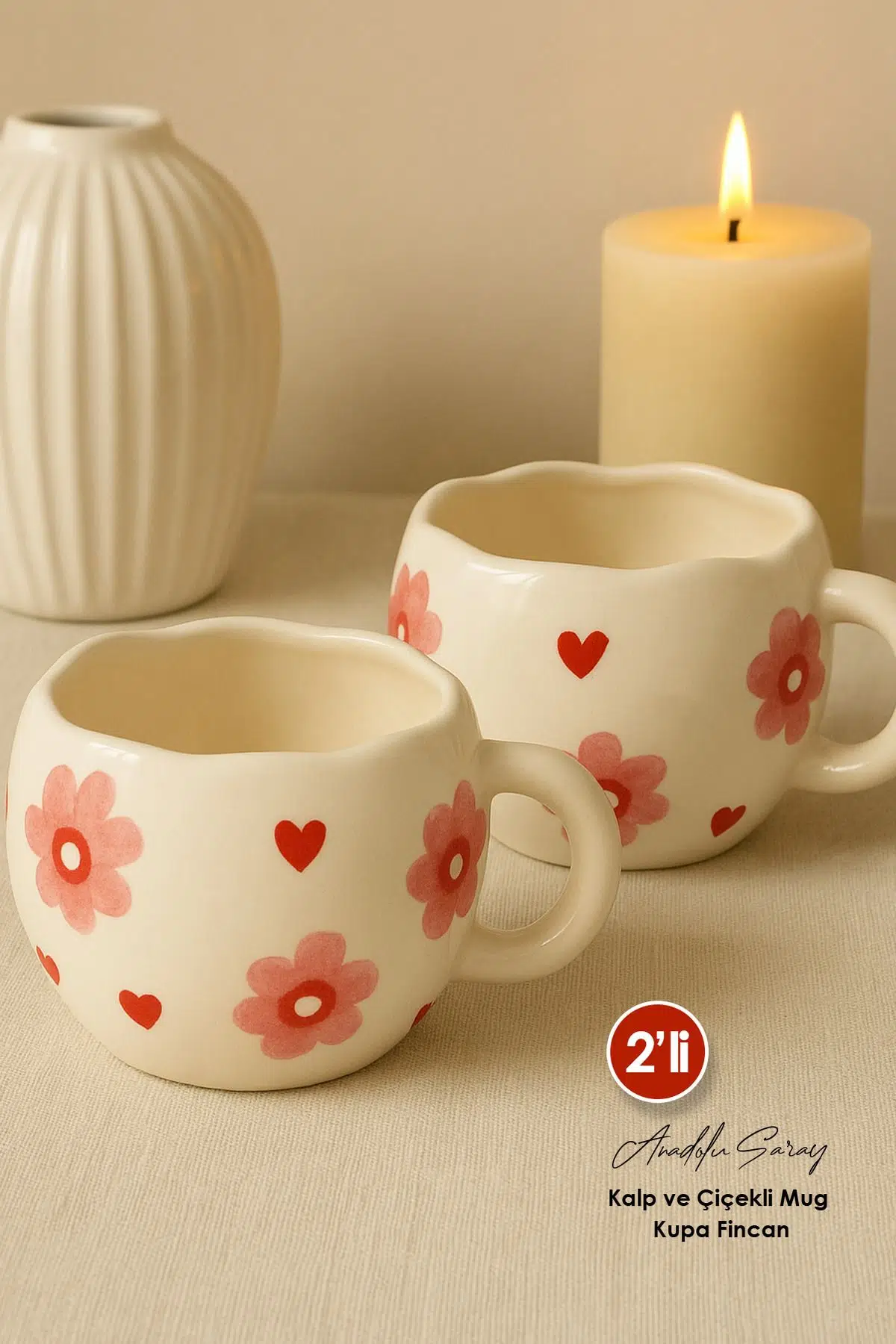 2 ADET El Yapımı Seramik Kalp ve Çiçekli Mug Kupa Fincan | Mug Fincan Kupa Kahve Kupası