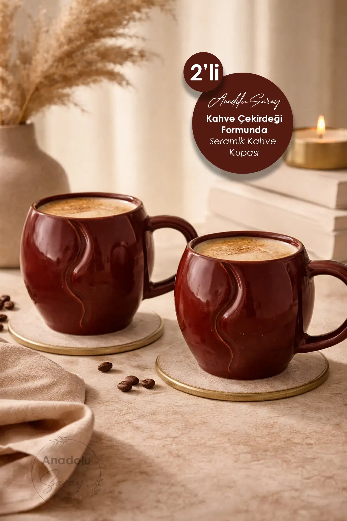 Kahve keyfini estetikle buluşturan kahve çekirdeği formunda seramik kahve kupası, özgün tasarımı ve modern çizgileriyle sofralara ve çalışma alanlarına şıklık katar.