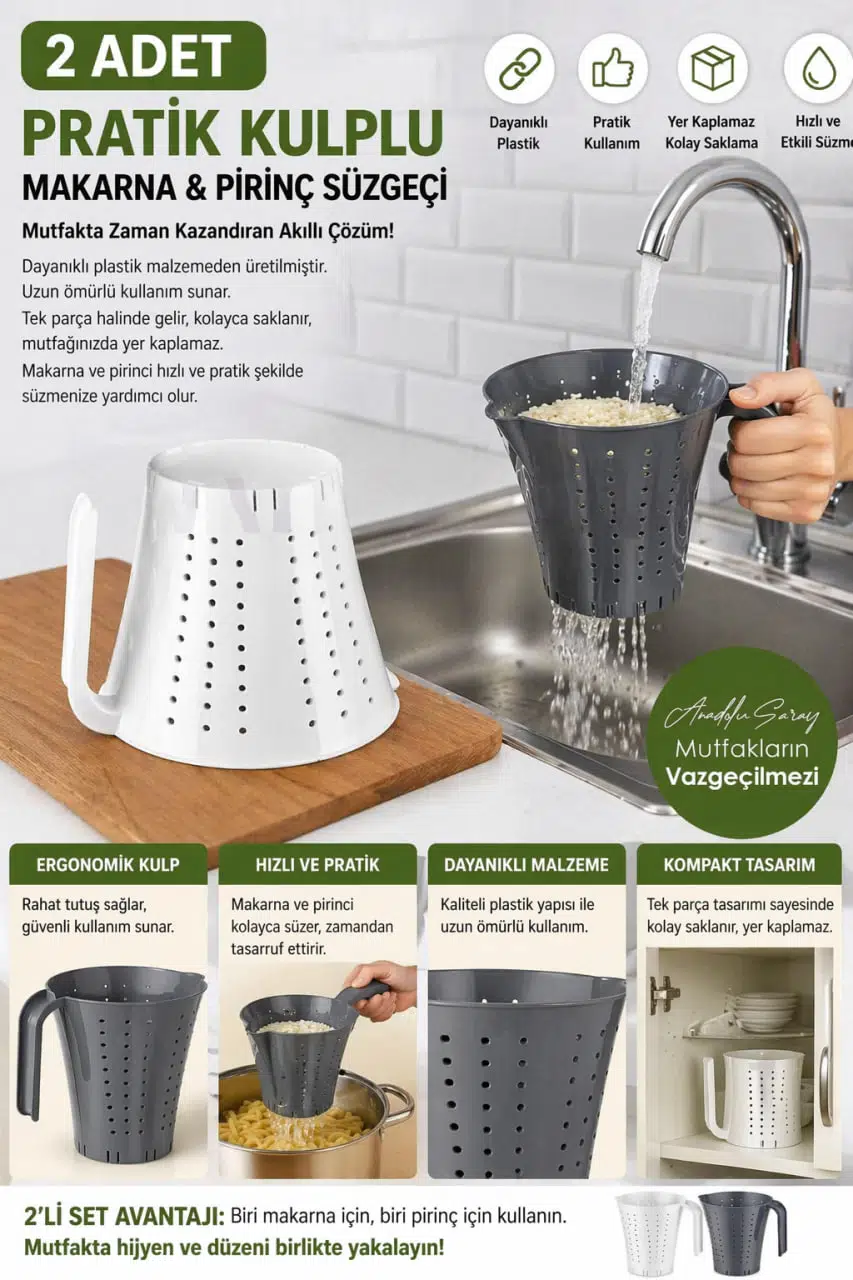 Mutfağınızda hız ve pratiklik arıyorsanız, 2 Adet Kulplu Makarna ve Pirinç Süzgeci Seti tam size göre!