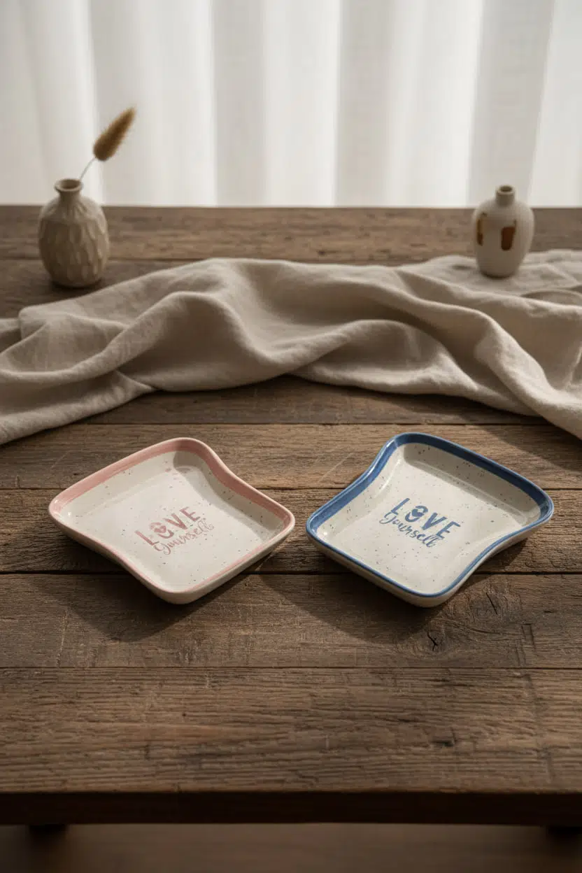 Yüksek kaliteli seramik malzemeden üretilmiş olan bu dekoratif tabaklar dayanıklı yapıya sahiptir. Takı tabağı, yüzük koyma tabağı, anahtarlık tabağı, mum altlığı veya küçük sunum tabağı olarak çok amaçlı kullanım imkanı sunar.