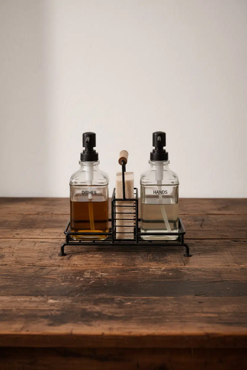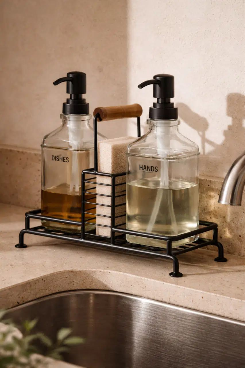 Mutfak tezgâhında bulaşık deterjanı ve el sabununu bir arada, düzenli şekilde konumlandırmanızı sağlar.