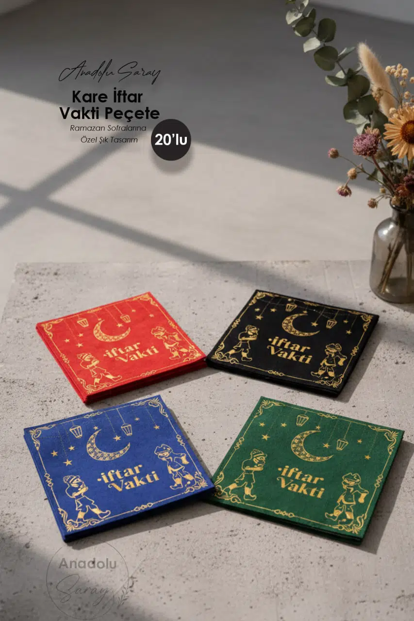 Ramazan sofralarınıza şıklık ve anlam katmak için özel olarak tasarlanan 20’li Kare İftar Vakti Peçete, zarif desenleri ve estetik görünümüyle misafir sofralarınızın tamamlayıcı parçası olur.