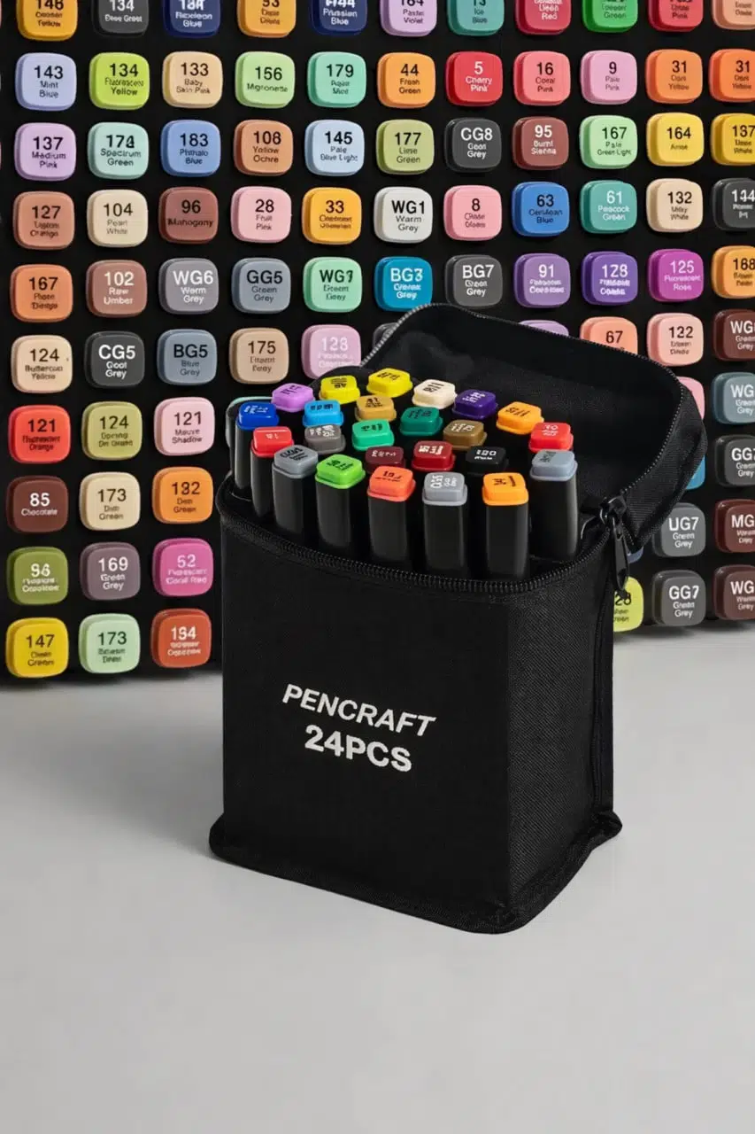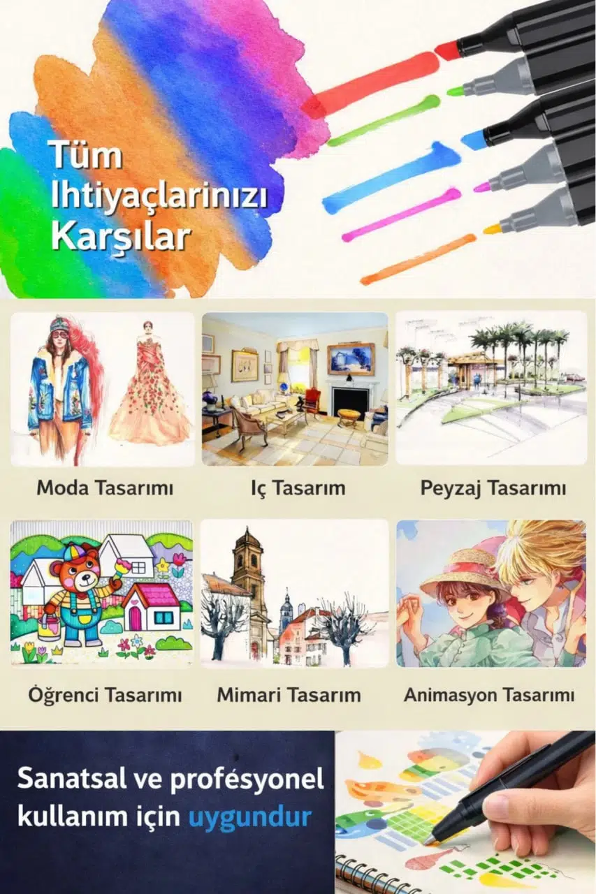 Yaratıcılığınıza profesyonel bir dokunuş katmak isteyenler için özel olarak tasarlanan 24’lü Çift Taraflı Profesyonel Marker Boya Kalem Seti, çizim, tasarım ve illüstrasyon çalışmalarında üstün performans sunar. Mimarlık, proje çizimleri, grafik tasarım, eskiz, manga ve hobi amaçlı kullanımlar için ideal bir settir.