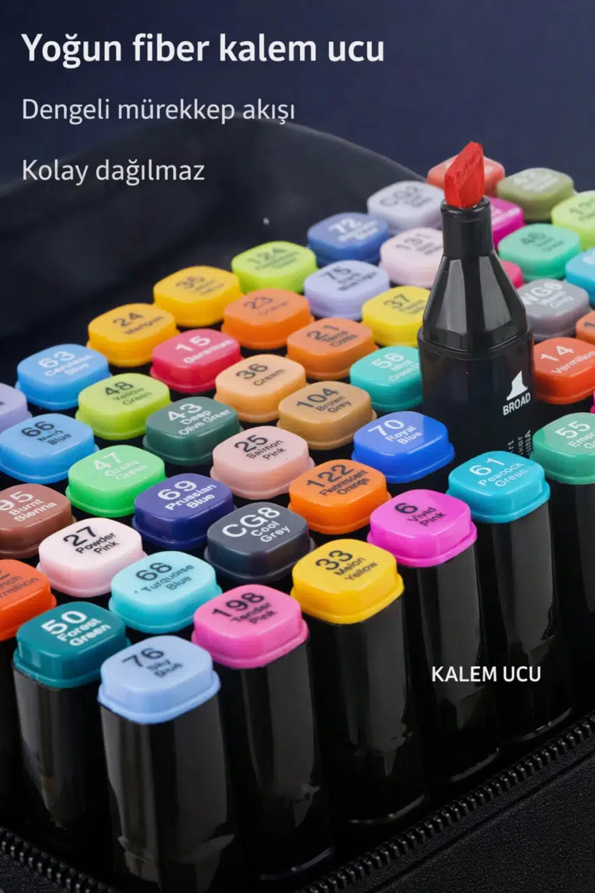Set içerisinde yer alan 24 farklı canlı ve doygun renk, çalışmalarınıza derinlik ve estetik kazandırır. Her marker kalem çift taraflı olup, biri ince detaylar için hassas uç, diğeri geniş alan boyamaları için kalın uç şeklinde tasarlanmıştır. Her iki uçta da aynı renk bulunur, böylece renk geçişleri ve detay kontrolü son derece kolaydır.