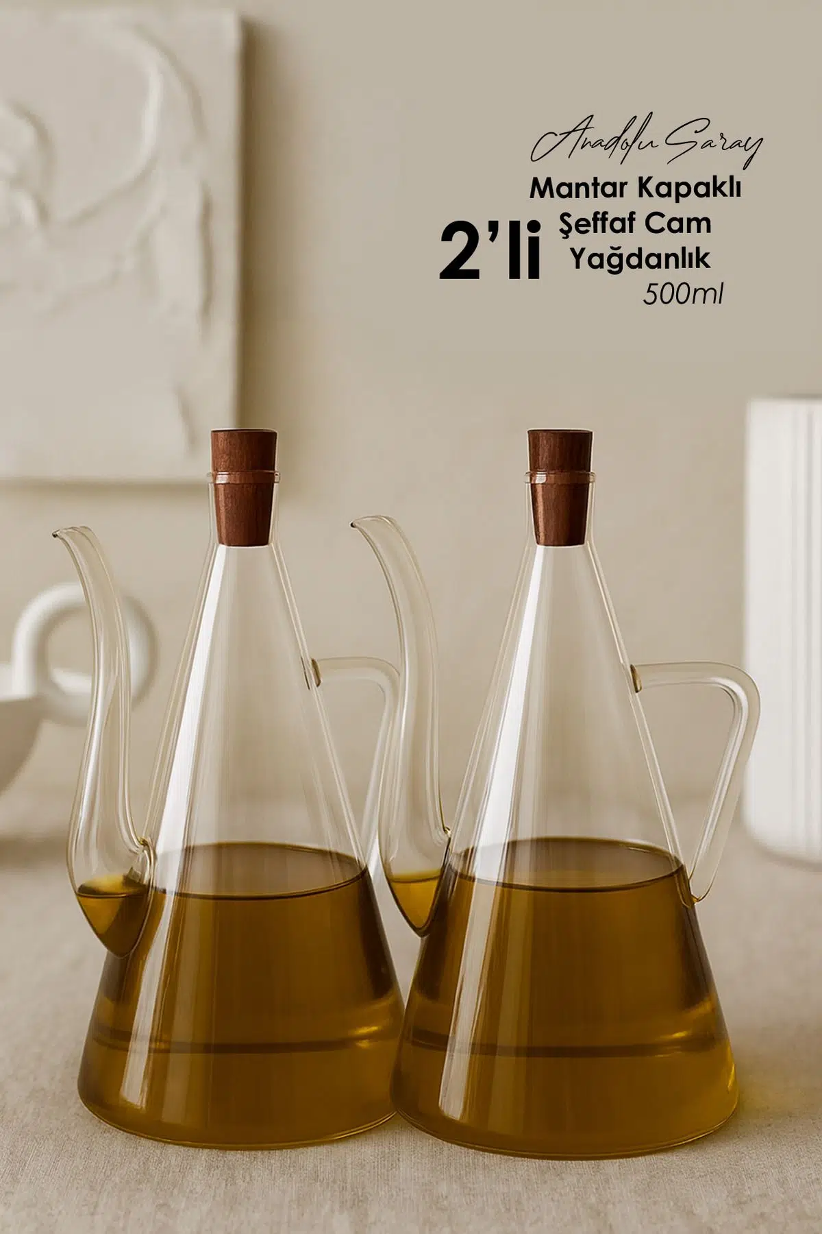 Modern ve zarif tasarımıyla mutfağınıza estetik bir dokunuş katan 500ml mantar kapaklı şeffaf cam yağdanlık, hem fonksiyonel hem de dekoratif bir üründür.