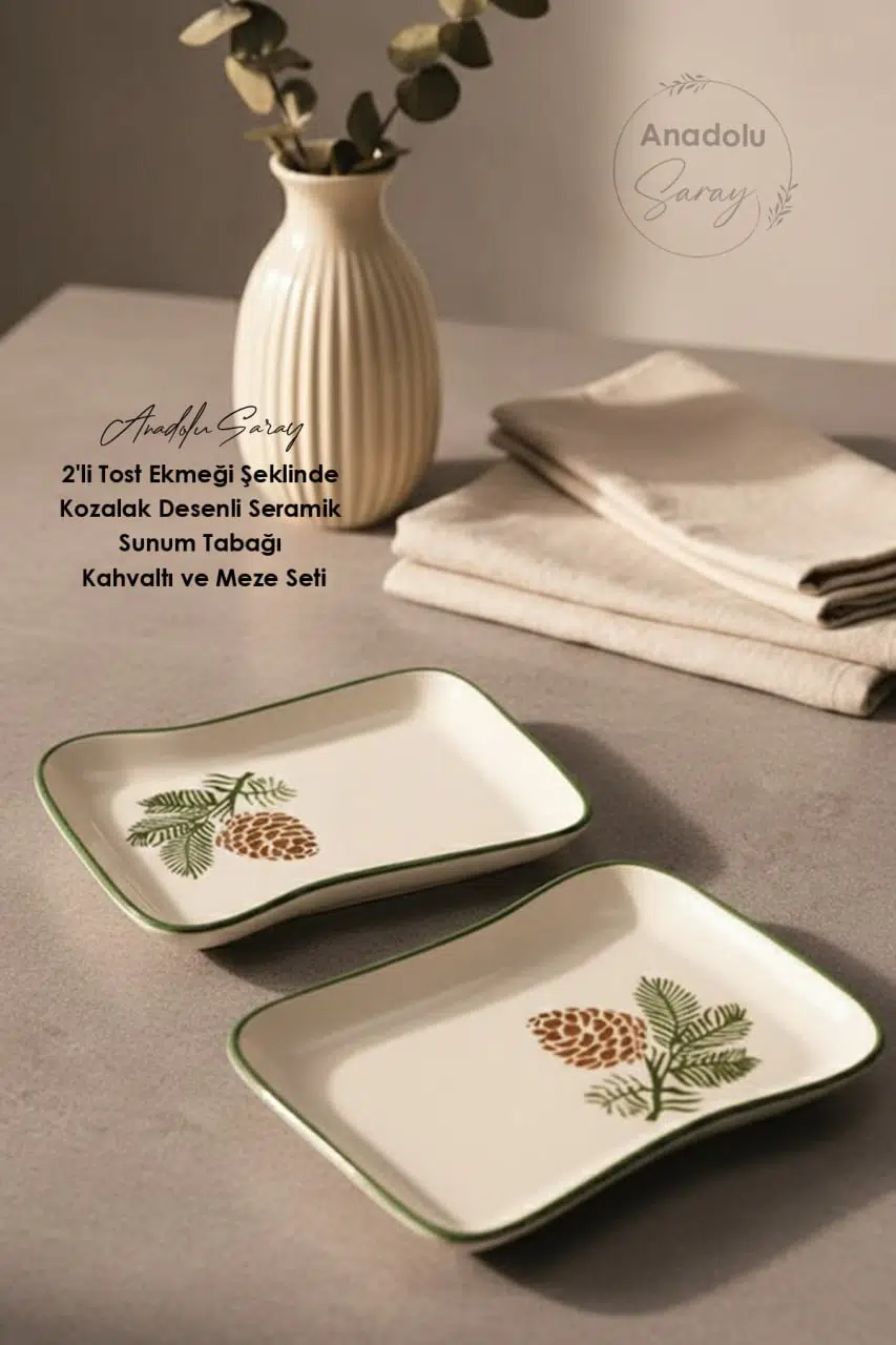 Tost ekmeği dilimi formunda tasarlanan bu özel 2'li sunum seti, zarif yeşil kenar detayları ve estetik çam kozalağı çizimleriyle sunumlarınıza sıcak bir atmosfer kazandırır.