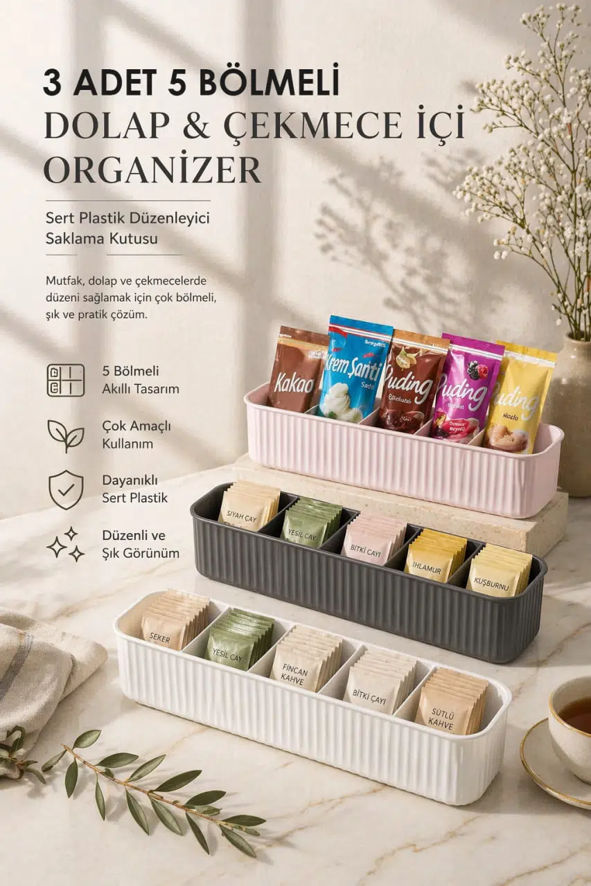 Evinizde düzeni kolayca sağlamak artık çok daha pratik! 3 adet 5 bölmeli organizer seti, dolap ve çekmece içindeki dağınıklığı ortadan kaldırarak eşyalarınızı kategorize etmenizi sağlar.