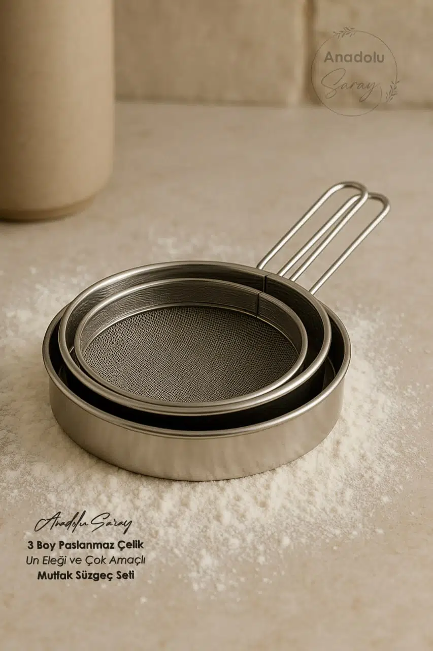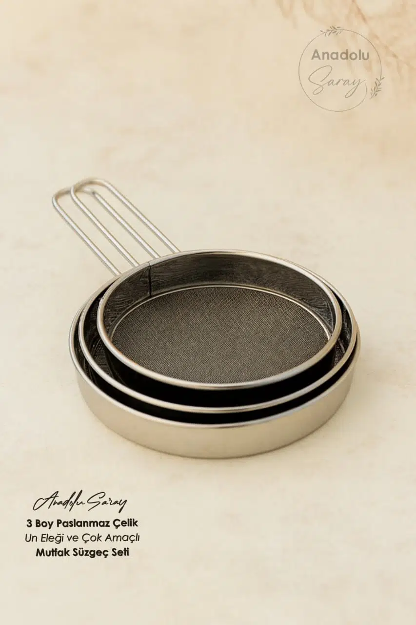 Mutfakta hem profesyonel hem de günlük kullanıma uygun olan 3 Boy Paslanmaz Çelik Un Eleği ve Süzgeç Seti, dayanıklı yapısı ve çok amaçlı kullanım avantajı ile işlerinizi kolaylaştırır.
