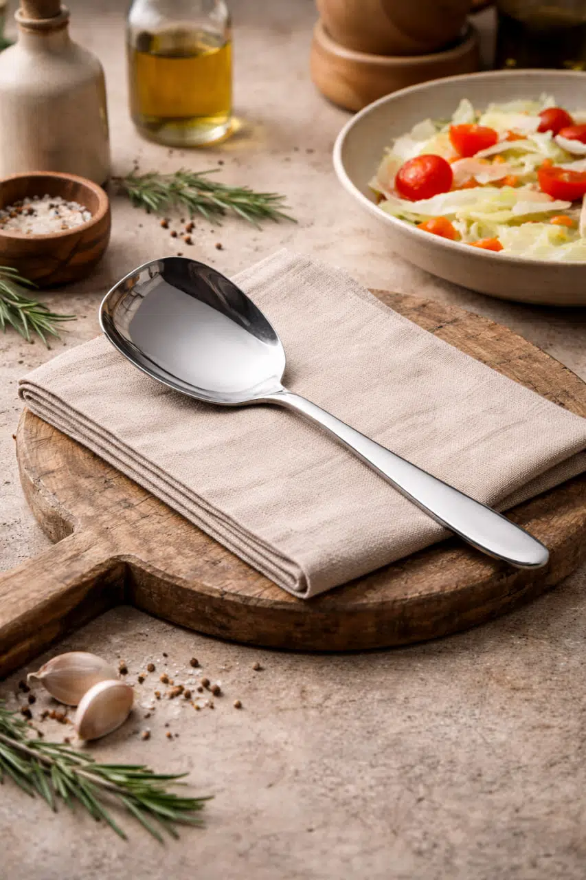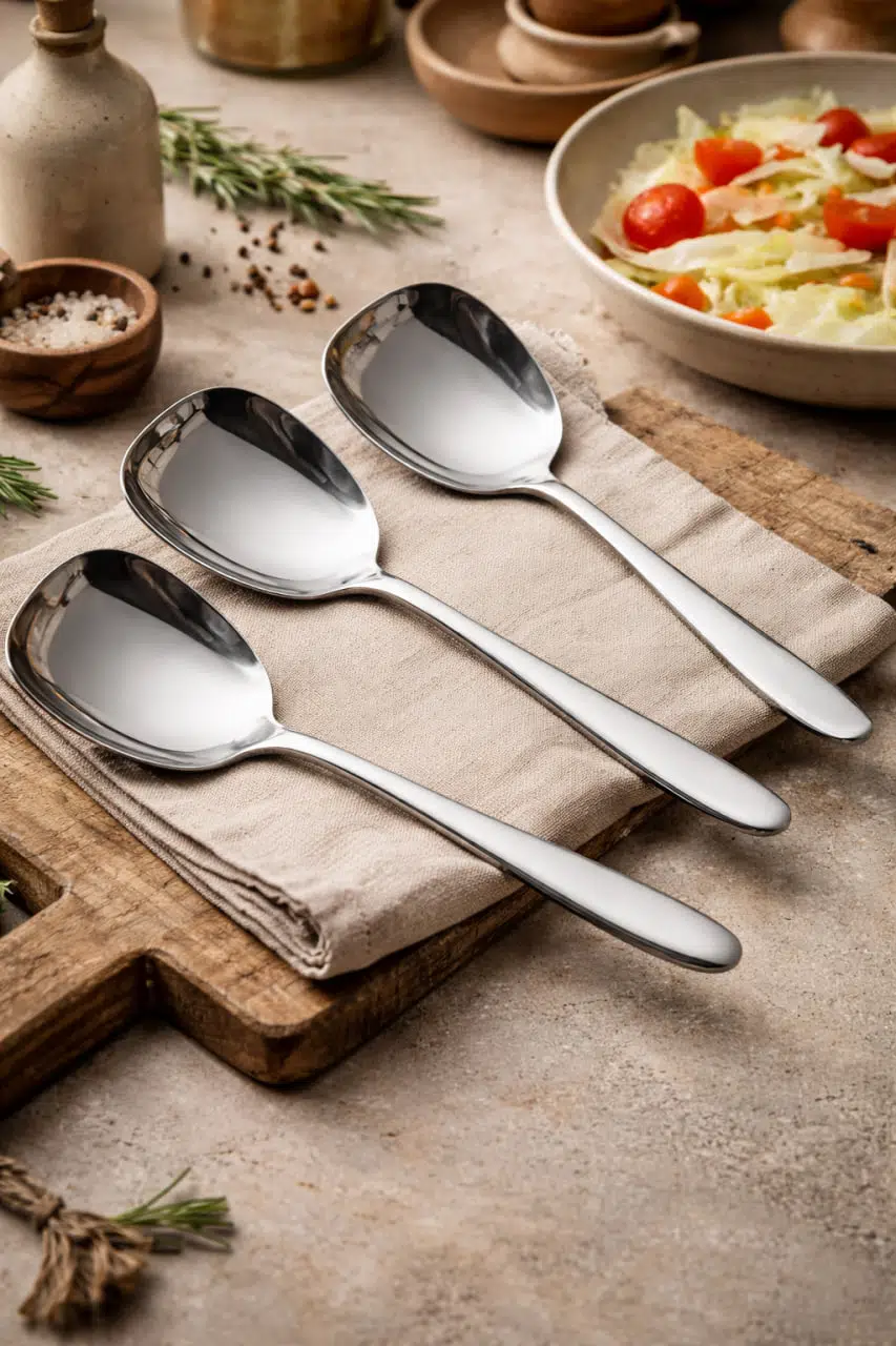 Şıklık ve fonksiyonelliği bir arada sunan 3 adet gümüş paslanmaz çelik servis kaşığı seti, mutfağınıza modern ve lüks bir dokunuş kazandırır.