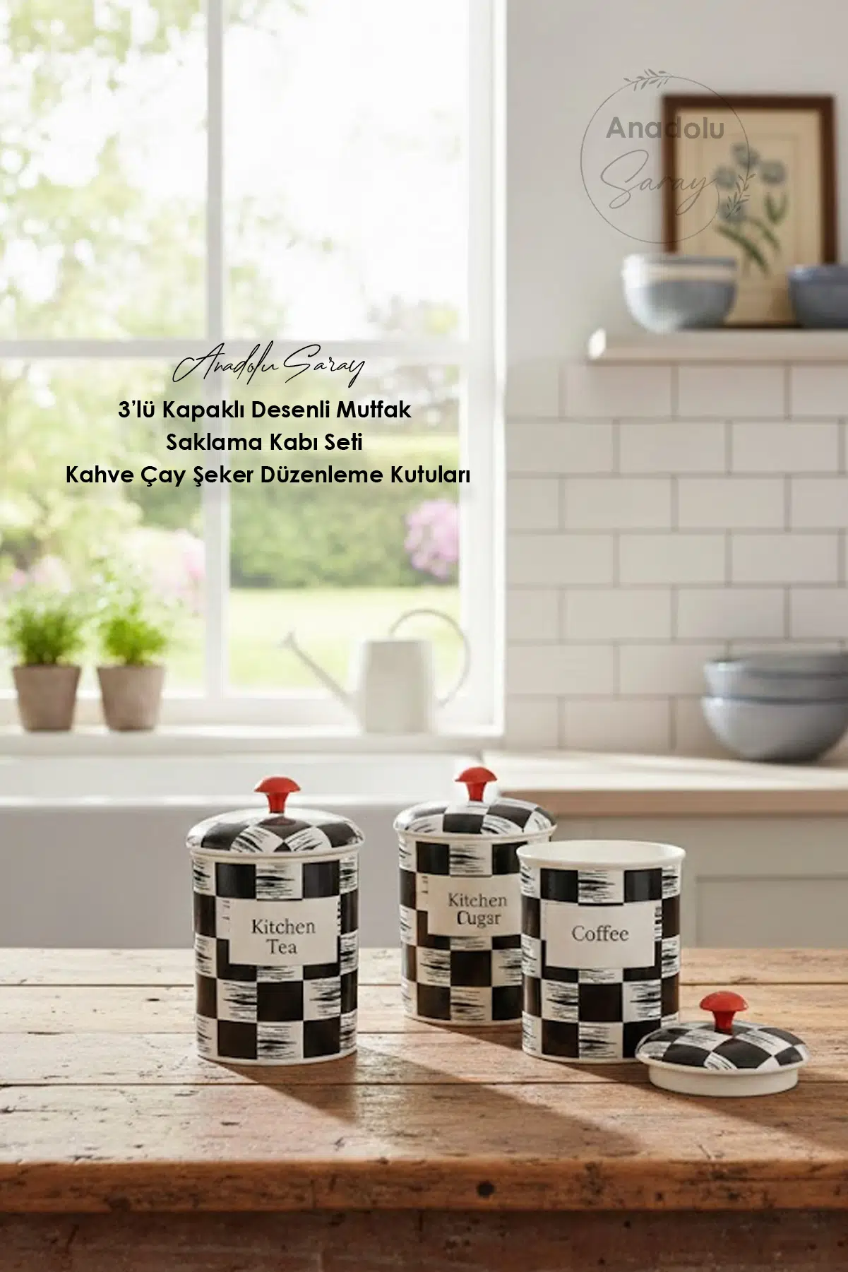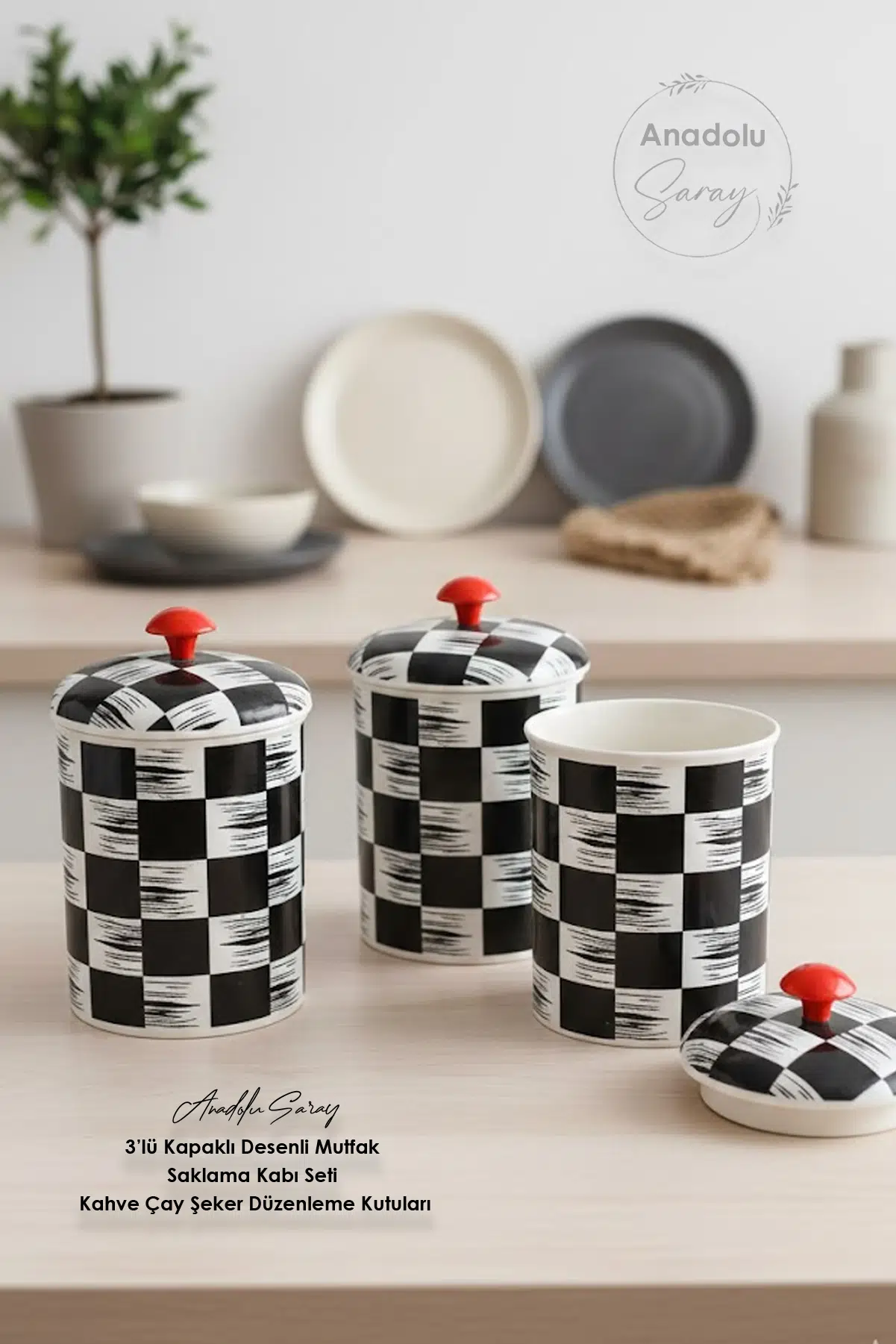 Şık siyah-beyaz desenleri ve kırmızı kapak detaylarıyla dekoratif bir görünüm sunarken, aynı zamanda çay, kahve, şeker gibi sık kullanılan ürünlerin hijyenik bir şekilde saklanmasını sağlar.