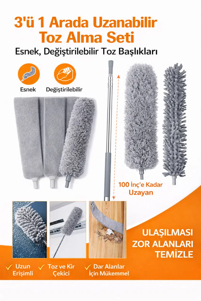 Evinizin her köşesine kolayca ulaşan, etkili ve pratik bir temizlik deneyimi için Uzayabilen Mikrofiber Manyetik Anti-Statik Bükülebilen Toz Alma 3’lü Full Set tam size göre!