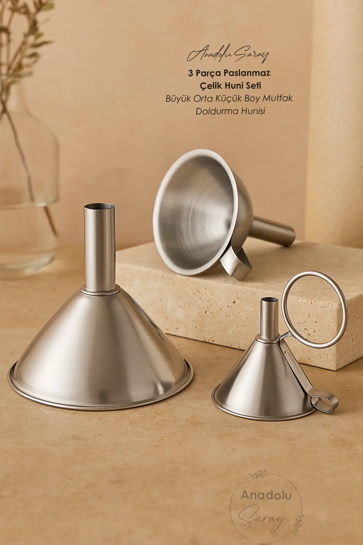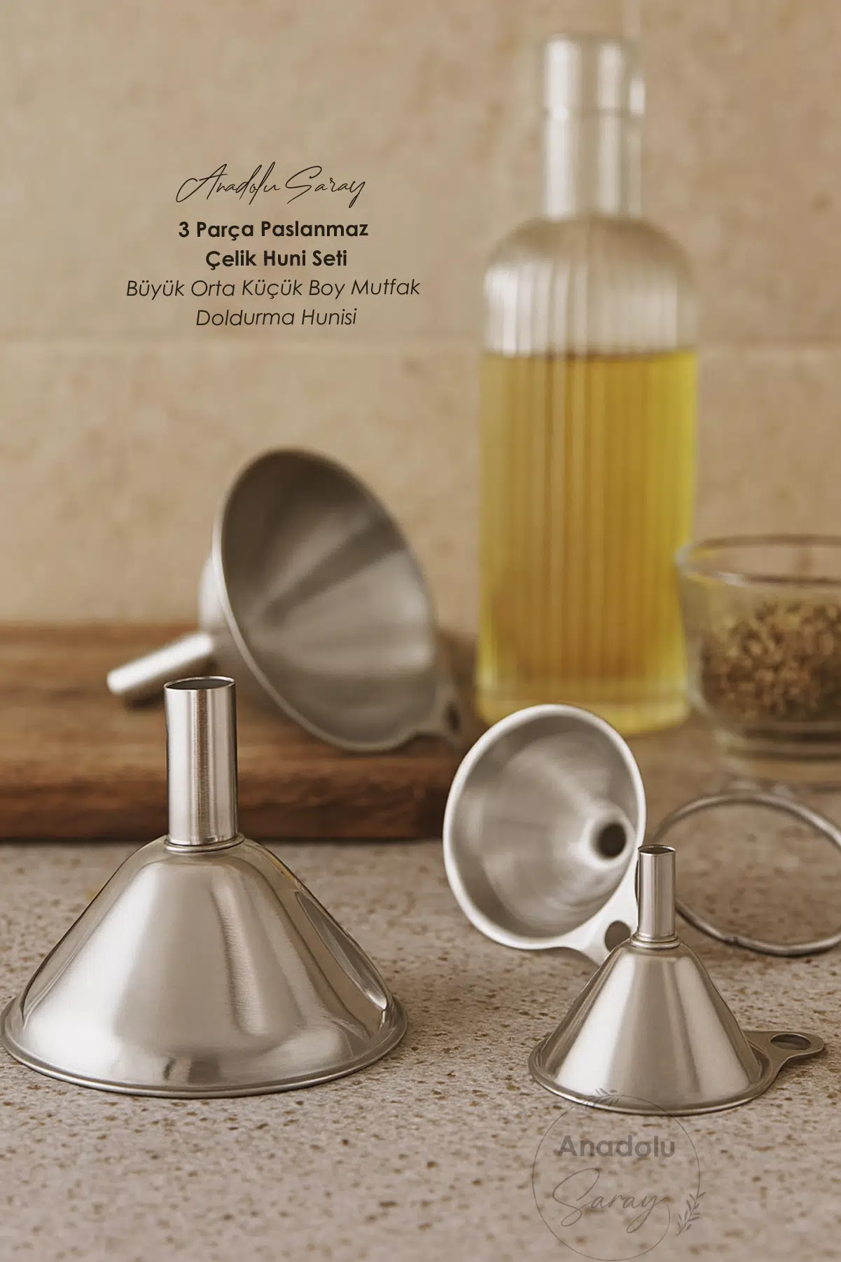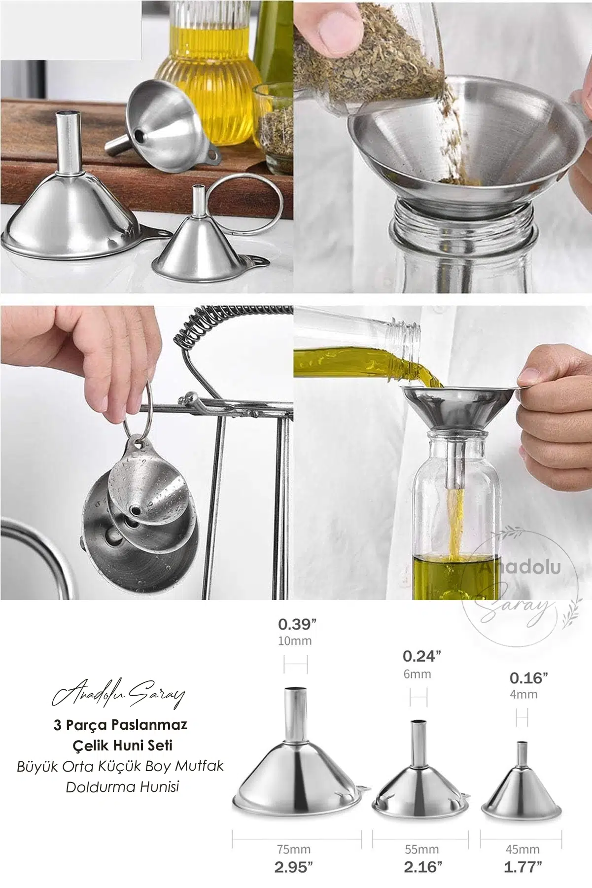 Bu 3 parçalı paslanmaz çelik huni seti, mutfakta sıvı ve kuru gıdaları kolayca aktarmanızı sağlayan dayanıklı ve hijyenik bir çözümdür.