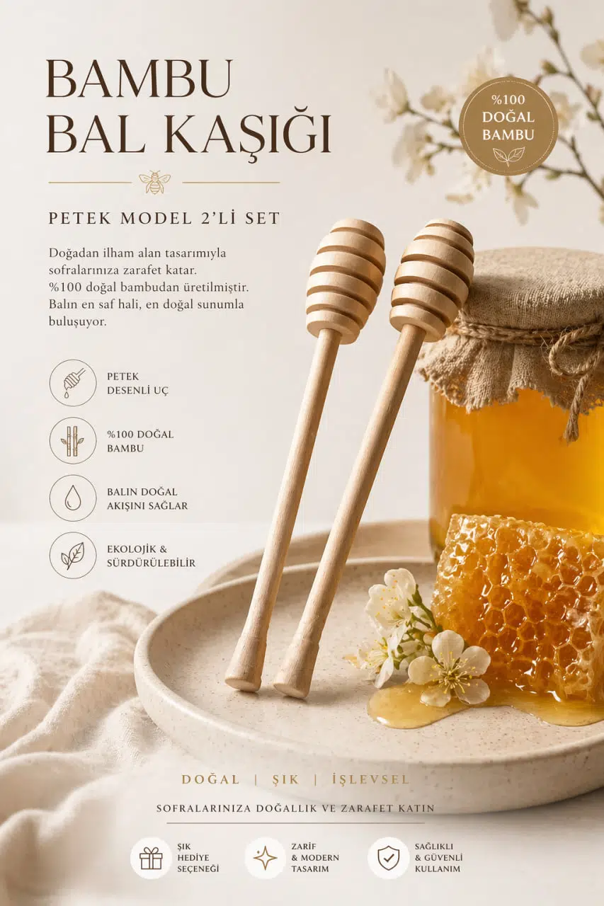 Doğallığı sofralarınıza taşıyan bambu bal kaşığı seti, estetik tasarımı ve işlevselliği ile bal keyfini bambaşka bir seviyeye çıkarır. %100 doğal bambudan üretilen bu özel petek desenli bal kaşığı, balın akışını kontrol ederek damlatmadan, pratik ve temiz kullanım sağlar.