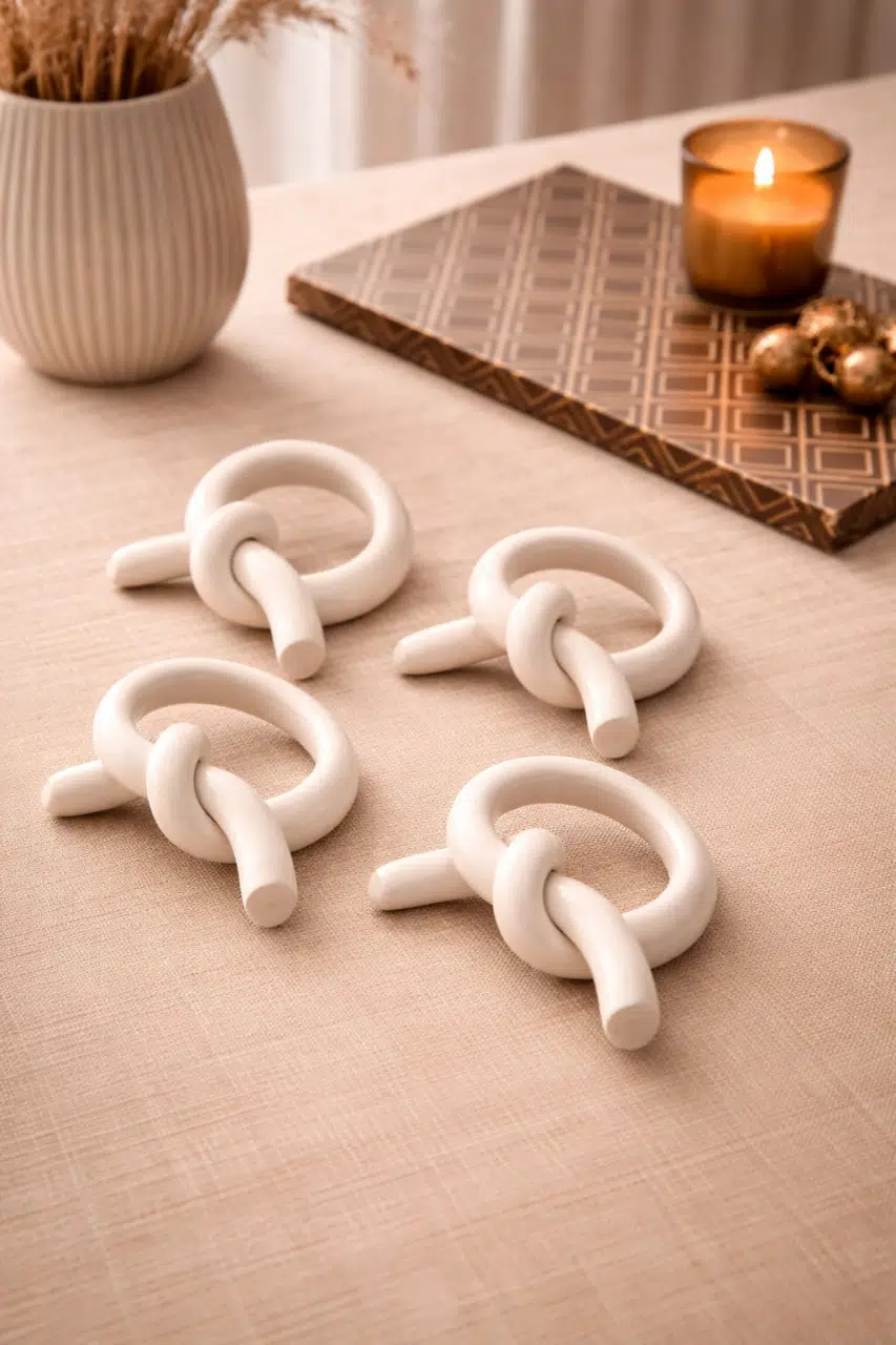 Doğal tonları ve düğüm formundaki modern tasarımı sayesinde; keten, pamuk ve örgü peçetelerle mükemmel uyum sağlar. Sofranıza sade ama güçlü bir stil kazandırır.