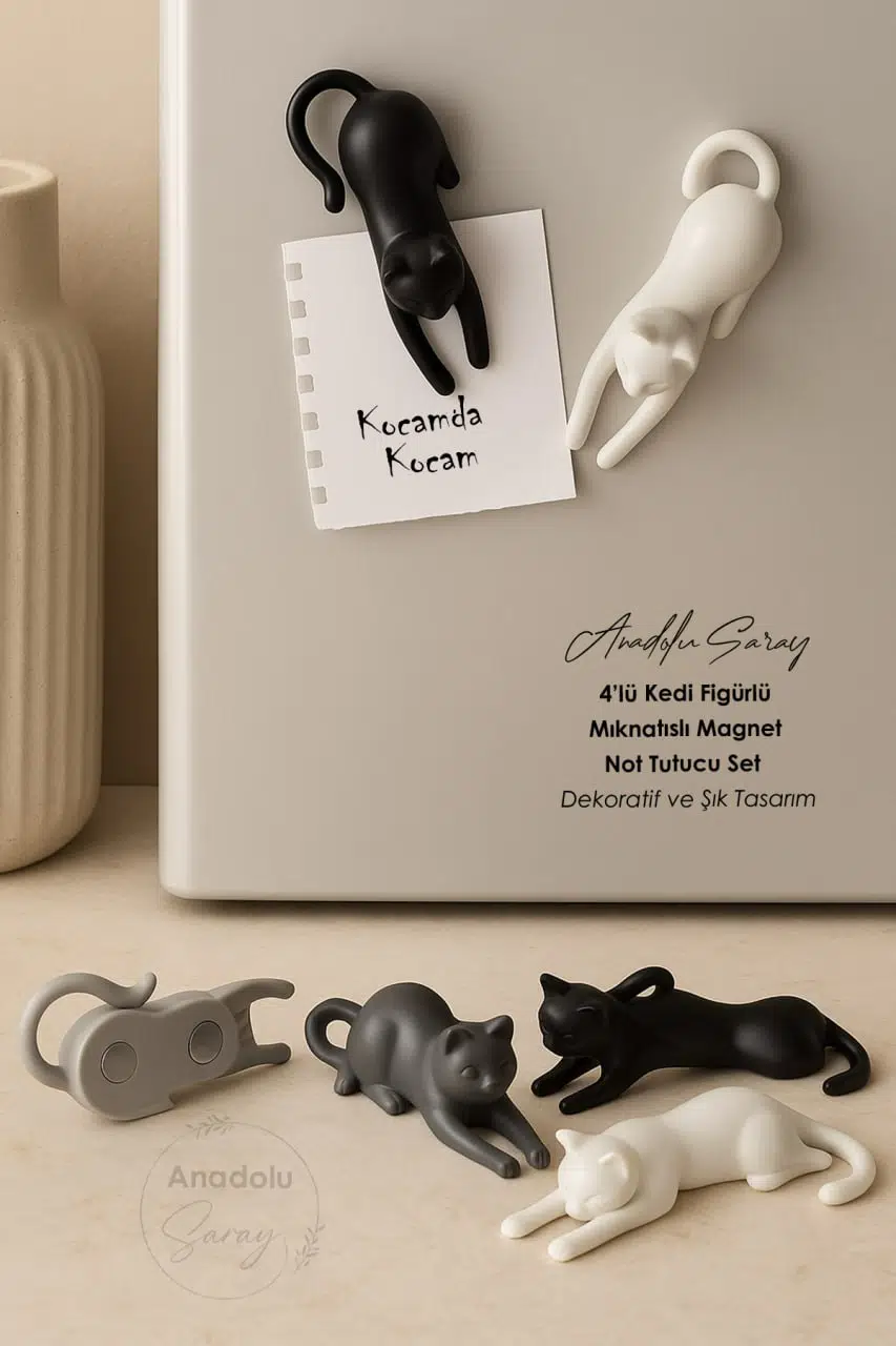 Ev dekorasyonuna sevimli bir dokunuş katmak isteyenler için özel olarak tasarlanmış 4’lü Kedi Figürlü Mıknatıslı Magnet ve Not Tutucu Set, hem işlevsel hem de estetik bir üründür.