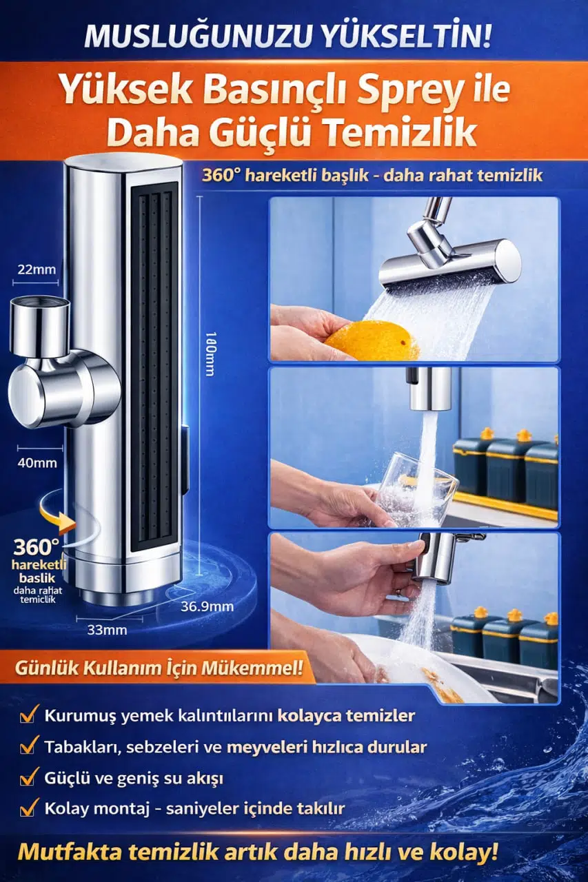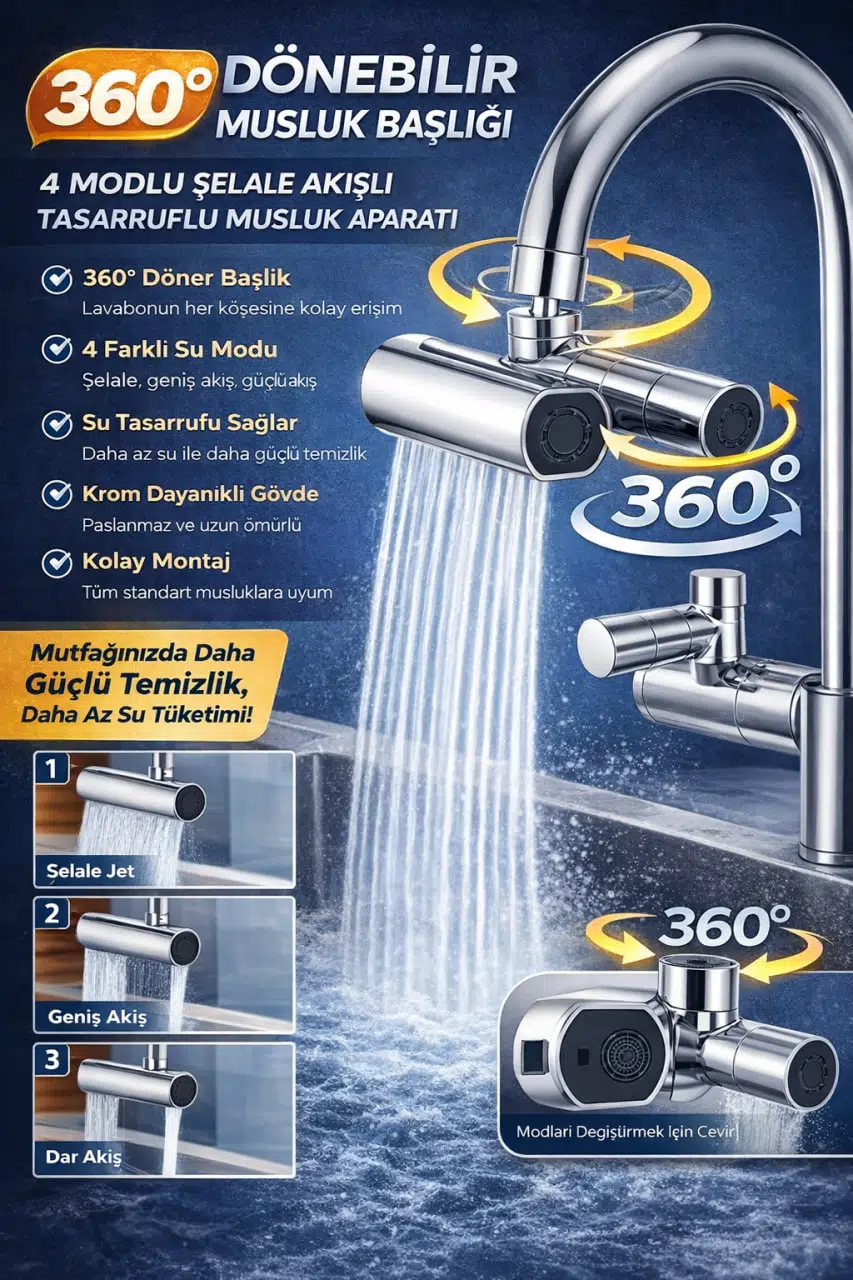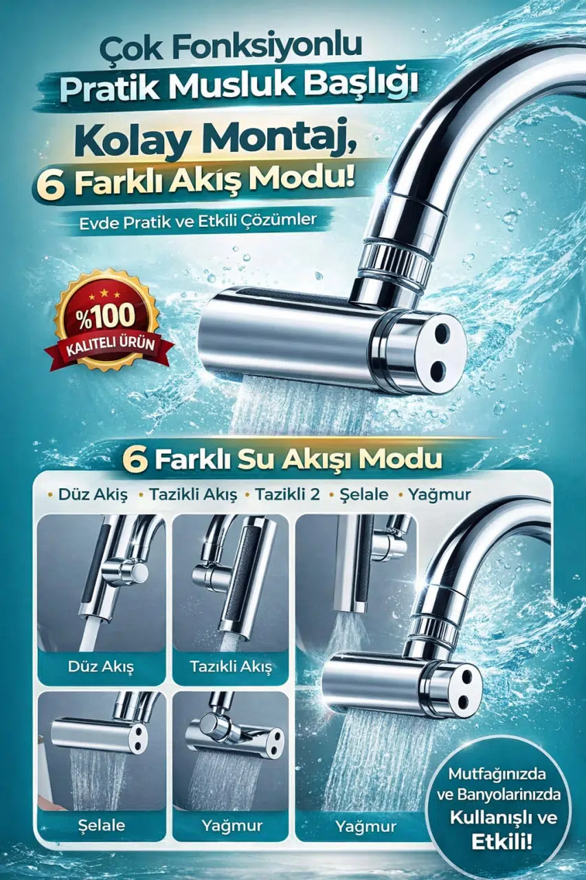 Mutfağınızda ve banyonuzda su kullanımını daha pratik, daha konforlu ve daha tasarruflu hale getiren 4 Modlu Şelale Musluk Başlığı, güçlü su akışı ve ayarlanabilir mod seçenekleri ile günlük kullanımınızı kolaylaştırır.