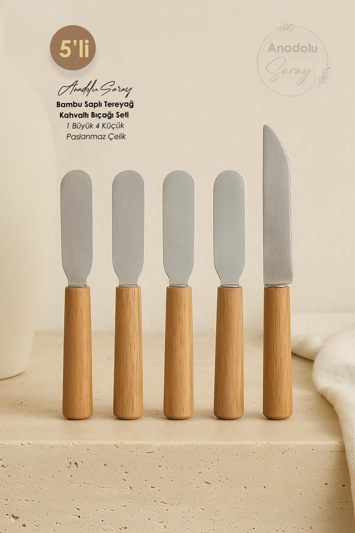 Doğal bambu sap detaylarıyla zarif bir tasarıma sahip bu 5’li tereyağ bıçağı seti, kahvaltı sofralarınıza sıcak ve estetik bir dokunuş kazandırır.