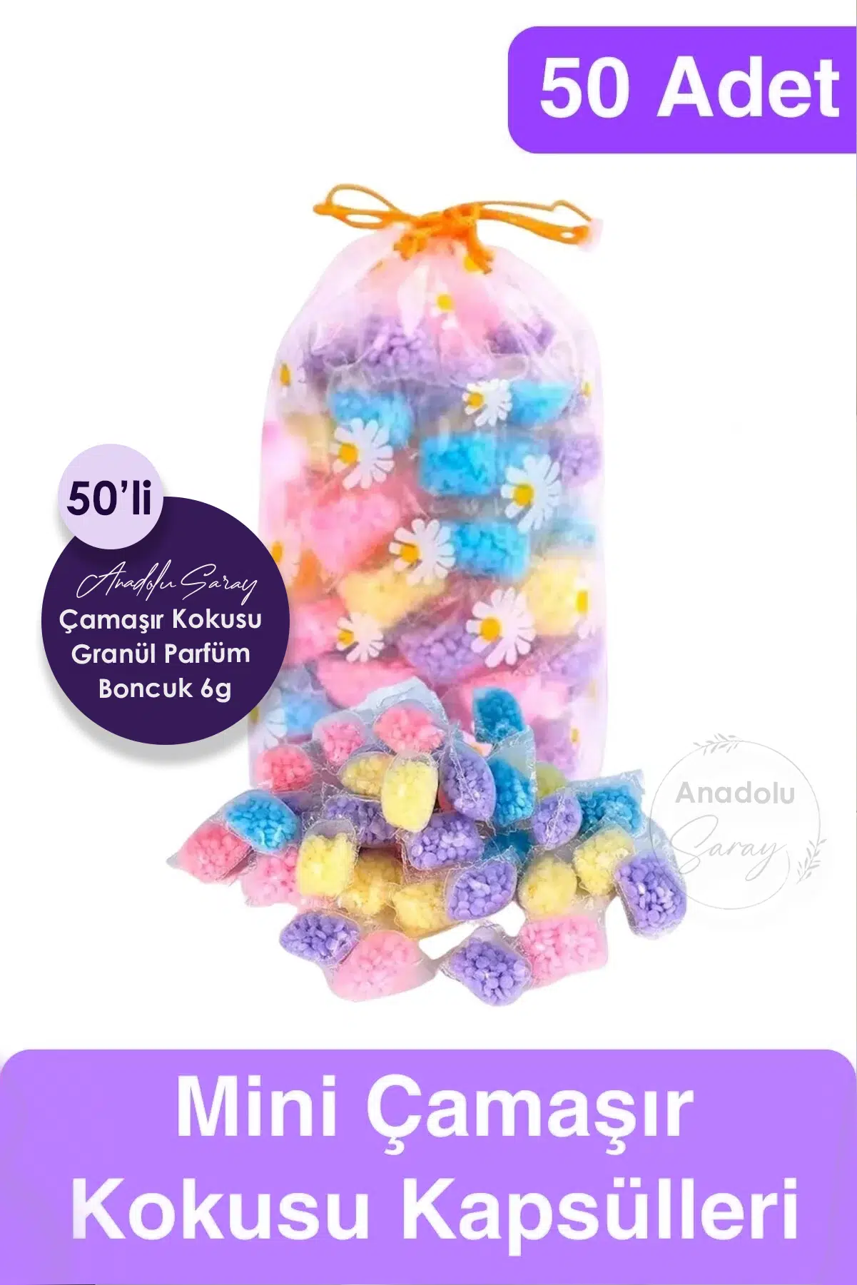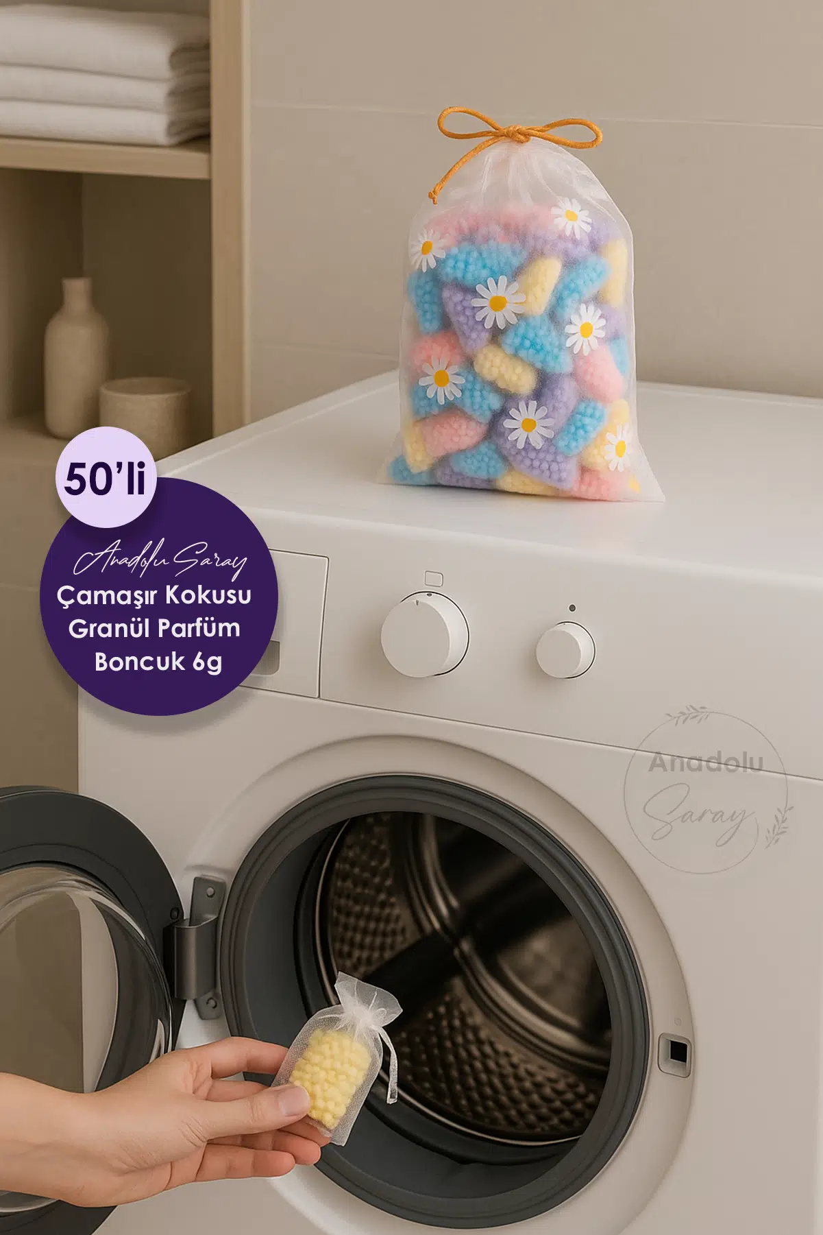 50 adet 6 gramlık çamaşır kokusu granül parfüm boncukları, her yıkamada çamaşırlarınıza taze, temiz ve harika bir koku kazandırır. Renkli, pastel tonlardaki bu küçük parfüm boncukları; çamaşır makinesinde, dolaplarda, valizlerde, arabalarda veya otel konaklamalarında kullanım için idealdir.