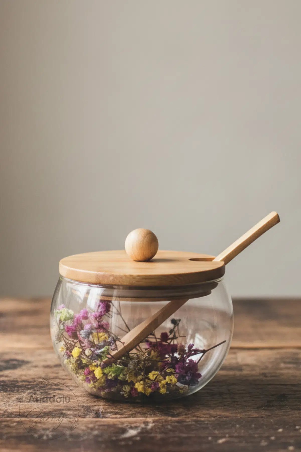 Cam gövdesi sayesinde içeriği kolayca görebilir, düzenli ve estetik bir sunum elde edebilirsiniz. Dayanıklı cam yapısı uzun ömürlü kullanım sunarken, bambu kapak kısmı ürüne sıcak ve doğal bir hava katar.