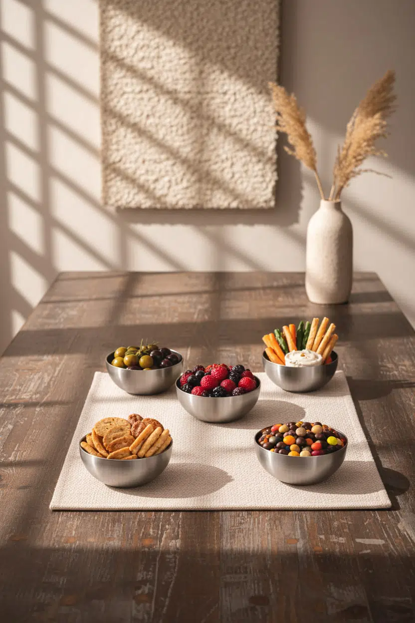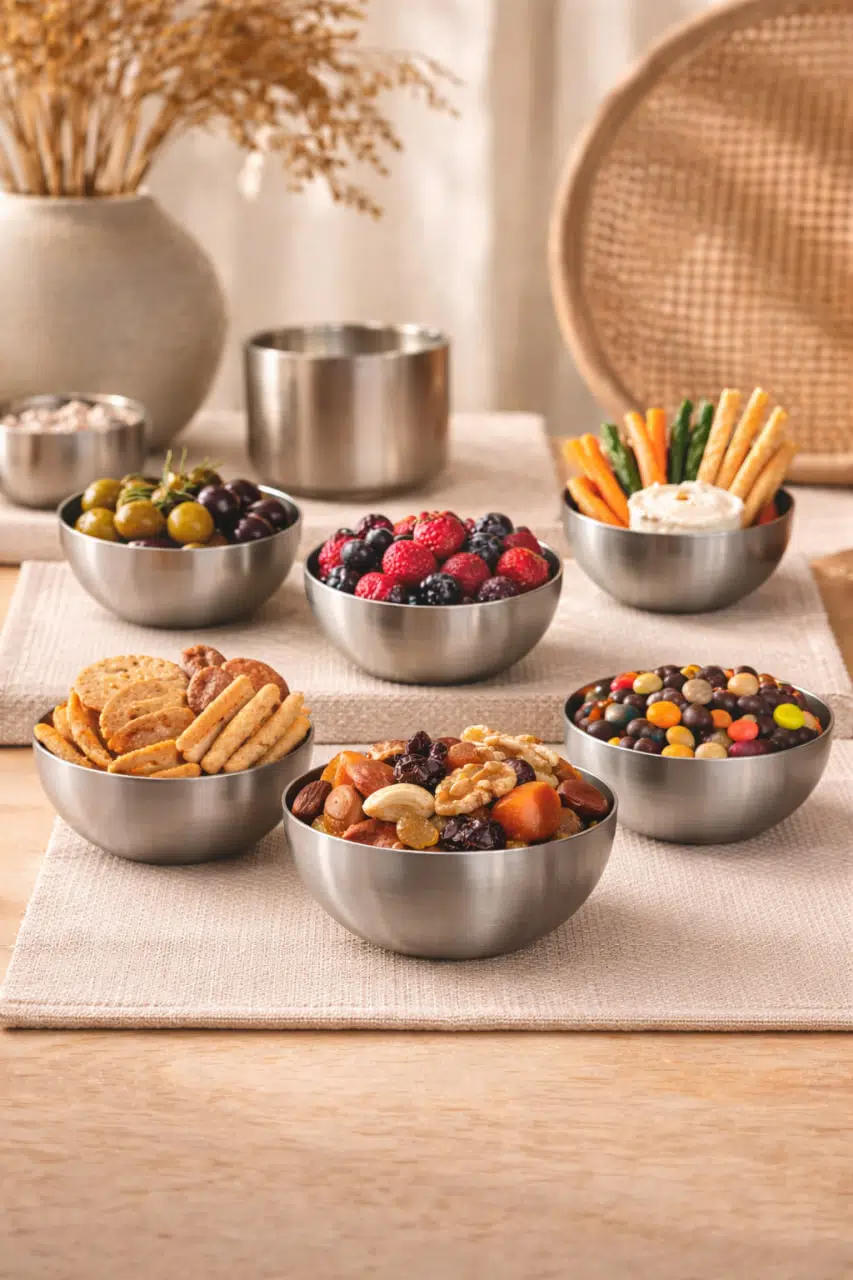 Şık ve fonksiyonel tasarımıyla öne çıkan 6’lı paslanmaz çelik çerezlik & sosluk seti, sofralarınıza modern bir dokunuş katar. Minimal ve zamansız görünümü sayesinde hem günlük kullanım hem de özel davetler için ideal bir sunum çözümüdür.