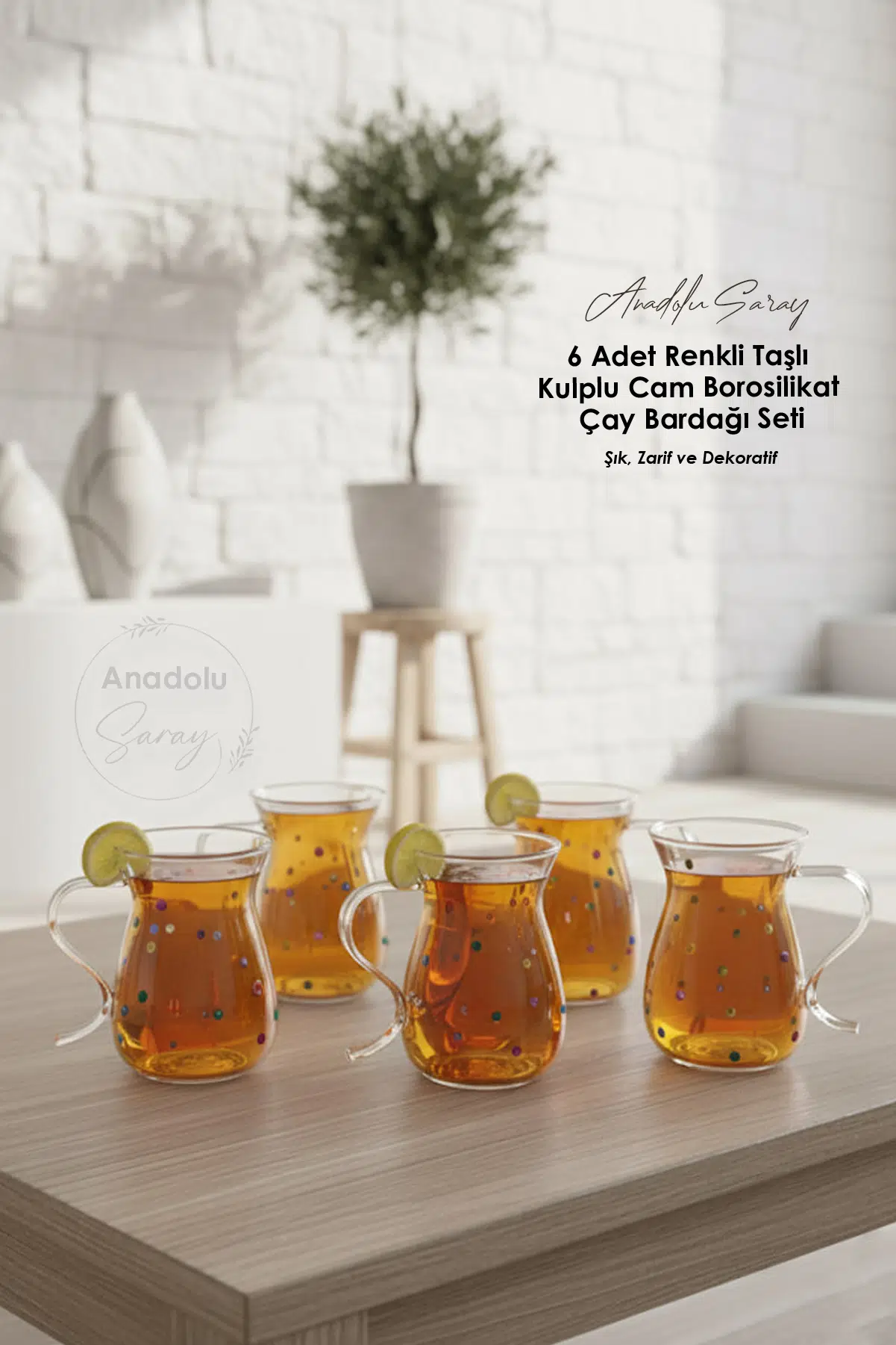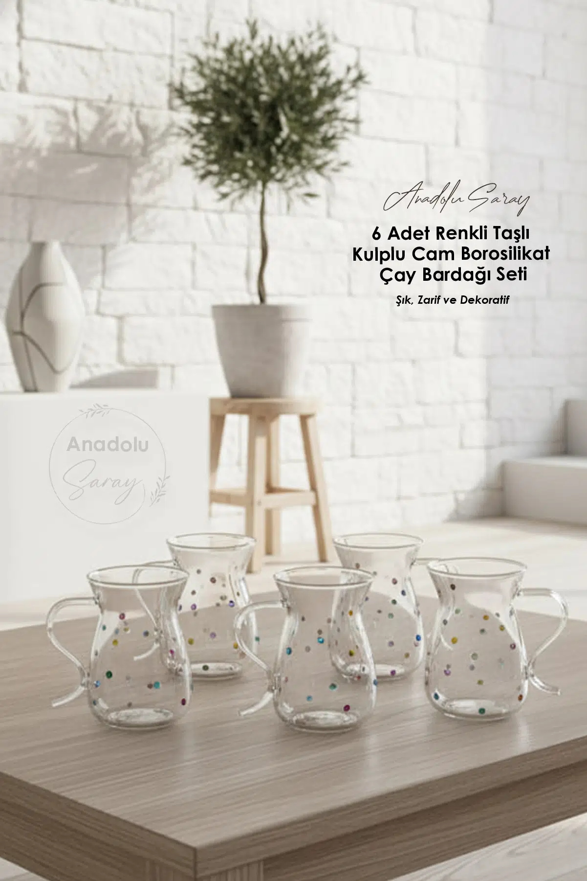Göz alıcı tasarımıyla sofralarınıza şıklık katacak 6 Adet Renkli Taşlı Kulplu Cam Borosilikat Çay Bardağı Seti, hem günlük kullanım hem de özel davetler için ideal.