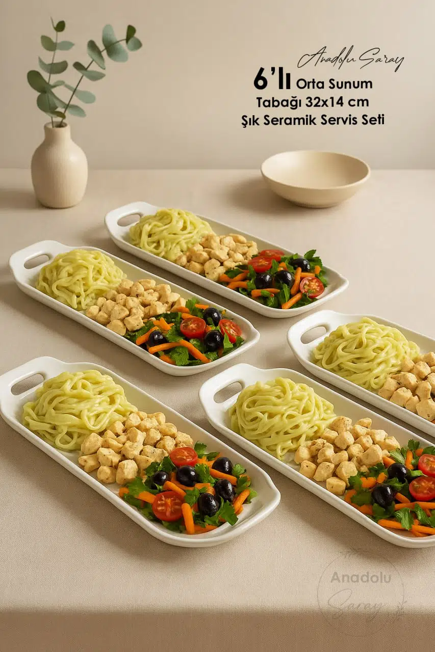 Modern sofralarınıza zarif bir dokunuş katın! 6’lı Orta Sunum Tabağı Seti (32x14 cm), hem evde hem de restoran sunumlarında profesyonel bir görünüm sağlamak için tasarlandı. Tavuk, makarna, salata, meze ve atıştırmalıklar için ideal boyutlardaki bu tabaklar, Tavuk Dünyası tarzı sunum konseptiyle şıklığı ve işlevselliği bir araya getirir.