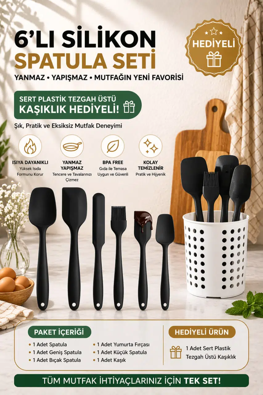 Günlük kullanım ve profesyonel tarifler için tasarlanan 6’lı silikon mutfak seti, yapışmaz yüzey dostu yapısı ve dayanıklı malzemesi ile mutfağınızın vazgeçilmezi olacak.