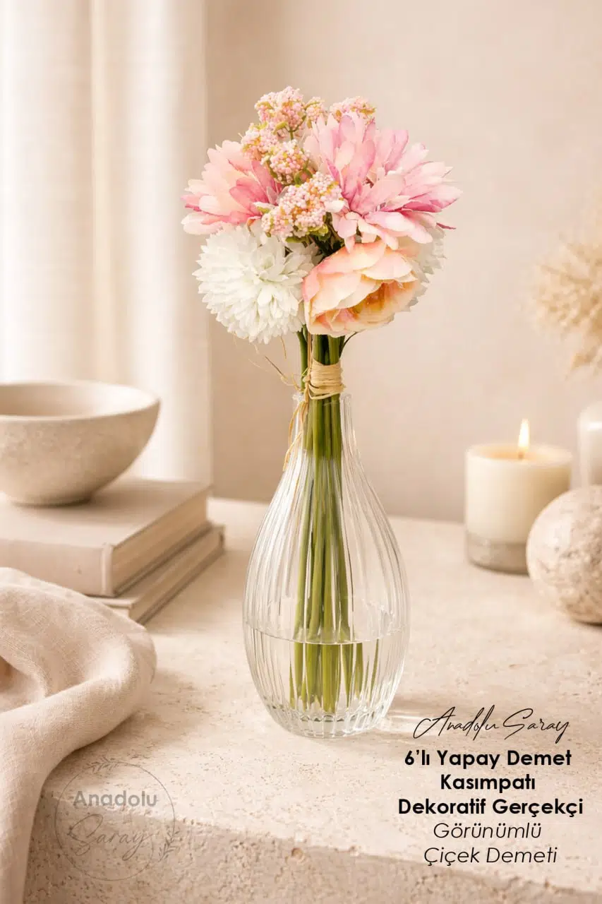 Yaşam alanlarınıza doğal ve zarif bir dokunuş katmak için tasarlanan 6’lı Yapay Demet Kasımpatı, gerçekçi dokusu ve estetik görünümüyle dekorasyonunuzu tamamlar.