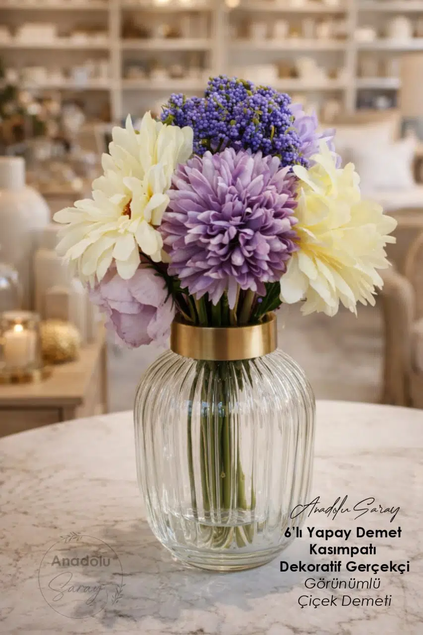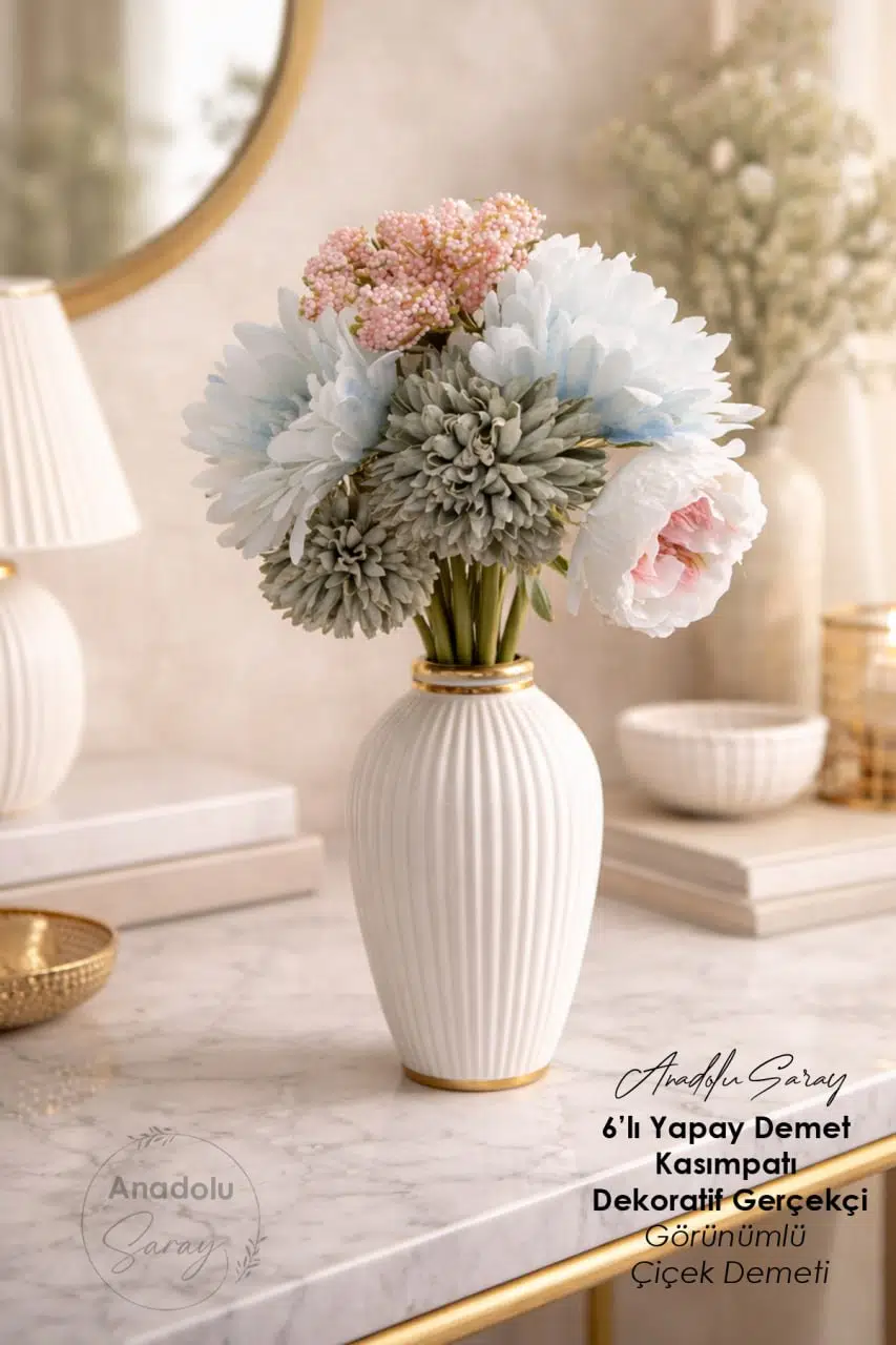Minimal, modern ve klasik dekorasyon stilleriyle uyumlu olan bu yapay kasımpatı demeti, bulunduğu ortama zarafet ve sıcaklık katar.