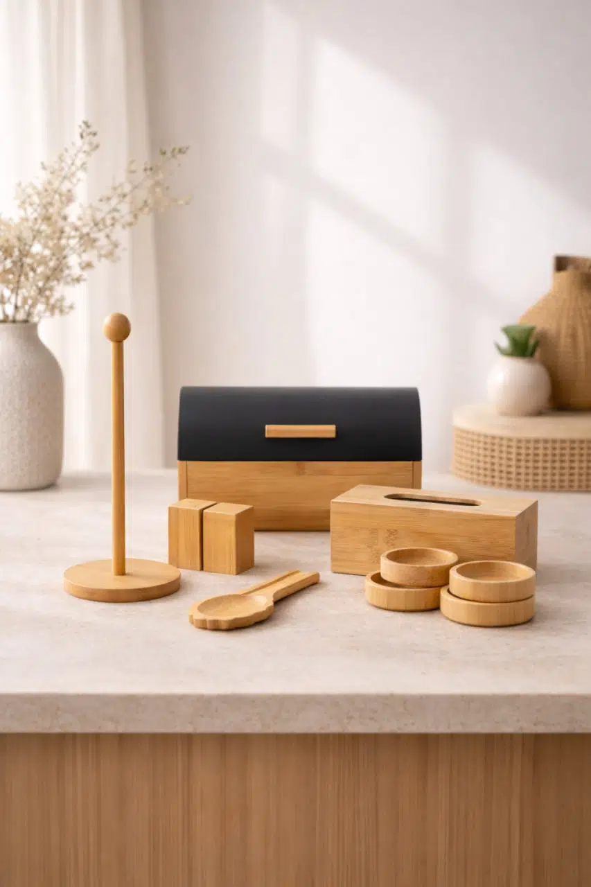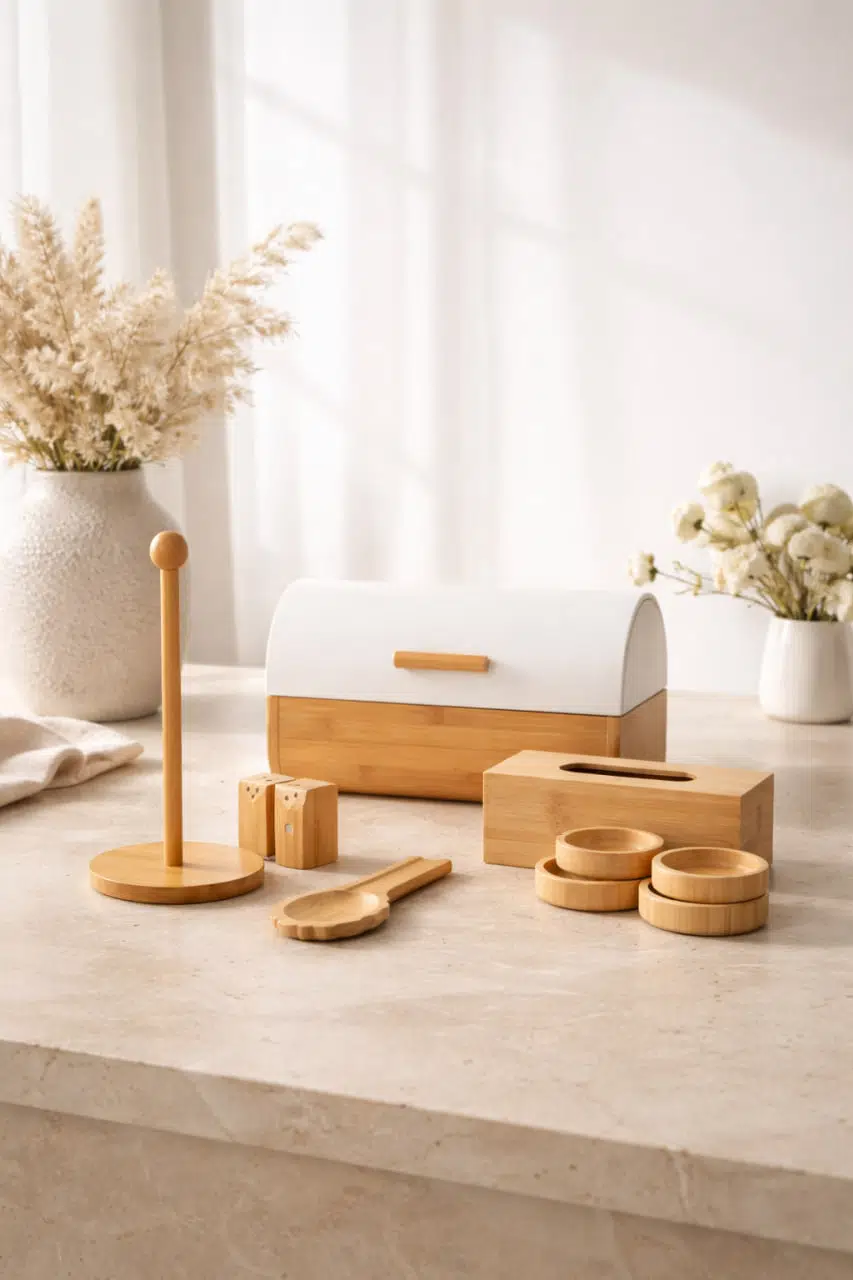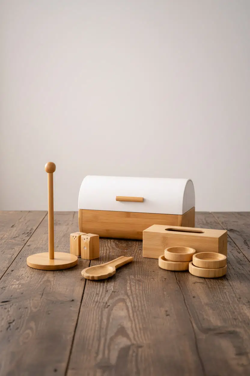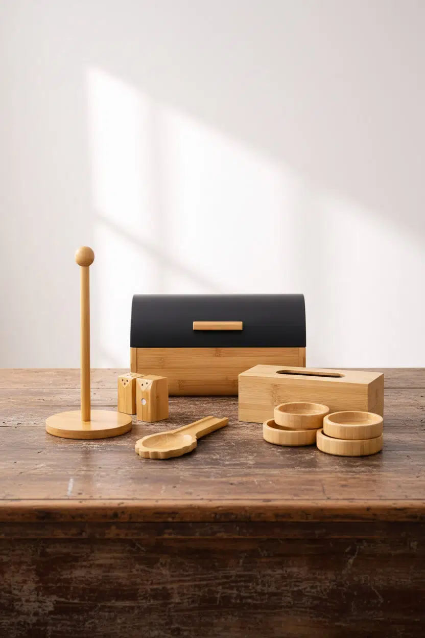 Ekmeklik, havluluk, peçetelik, kaşıklık, tuzluk ve kaselerden oluşan bu bambu mutfak seti; hem kullanışlı hem dekoratif yapısıyla mutfağınıza sıcak ve doğal bir atmosfer kazandırır.
