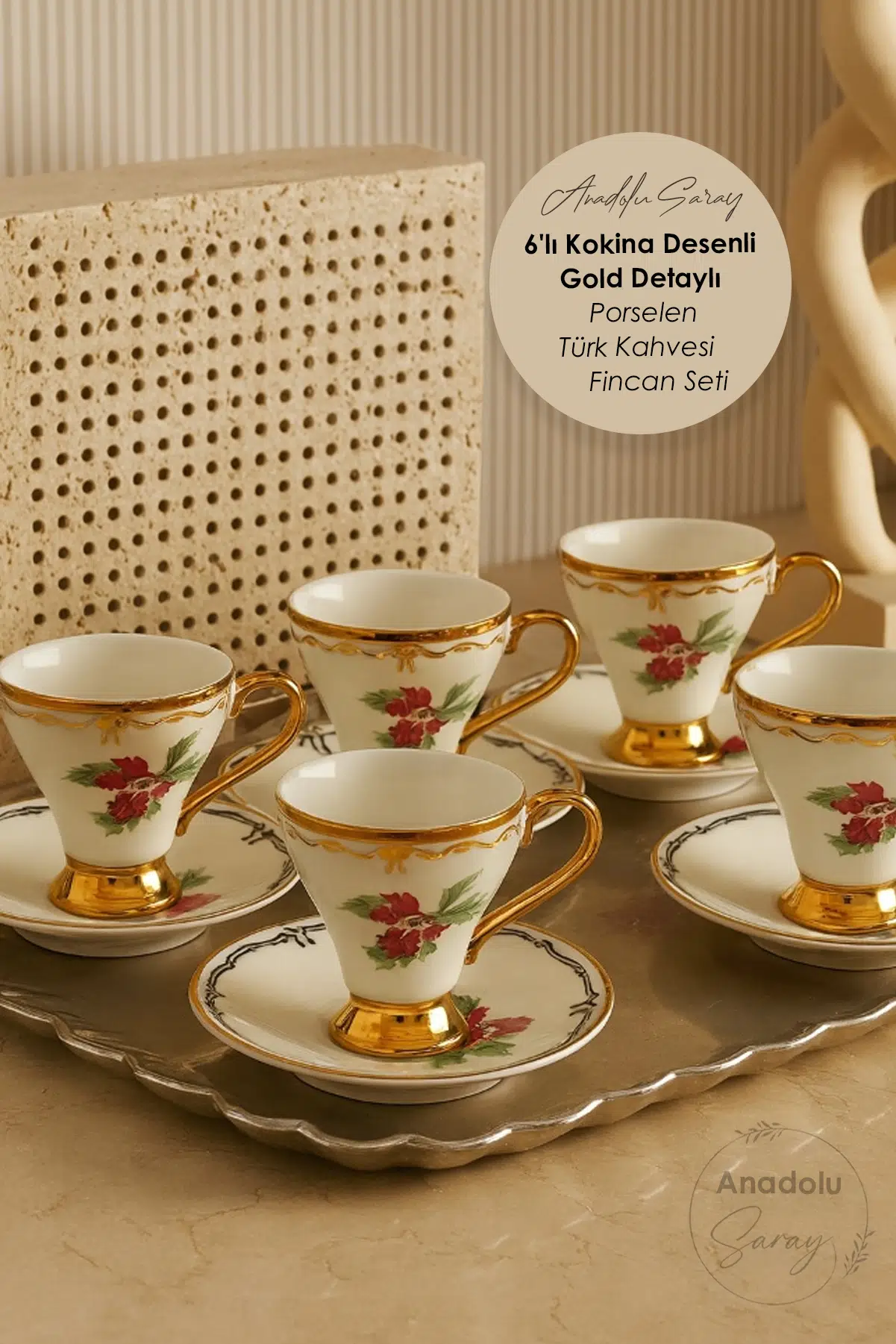 Kokina esintilerini modern çizgilerle buluşturan bu gold detaylı porselen Türk kahvesi fincan seti, hem günlük kullanıma hem de özel davetlere şıklık katan zarif bir tasarıma sahiptir.