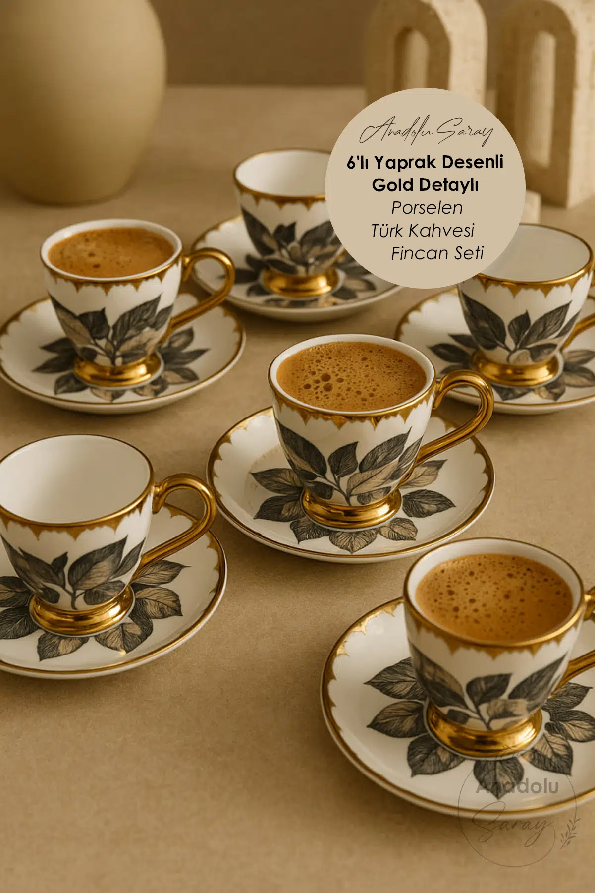 Şık ve zarif tasarımıyla dikkat çeken 6’lı yaprak desenli gold detaylı porselen Türk kahvesi fincan seti, kahve sunumlarınıza estetik bir dokunuş katmak için özenle hazırlanmıştır.