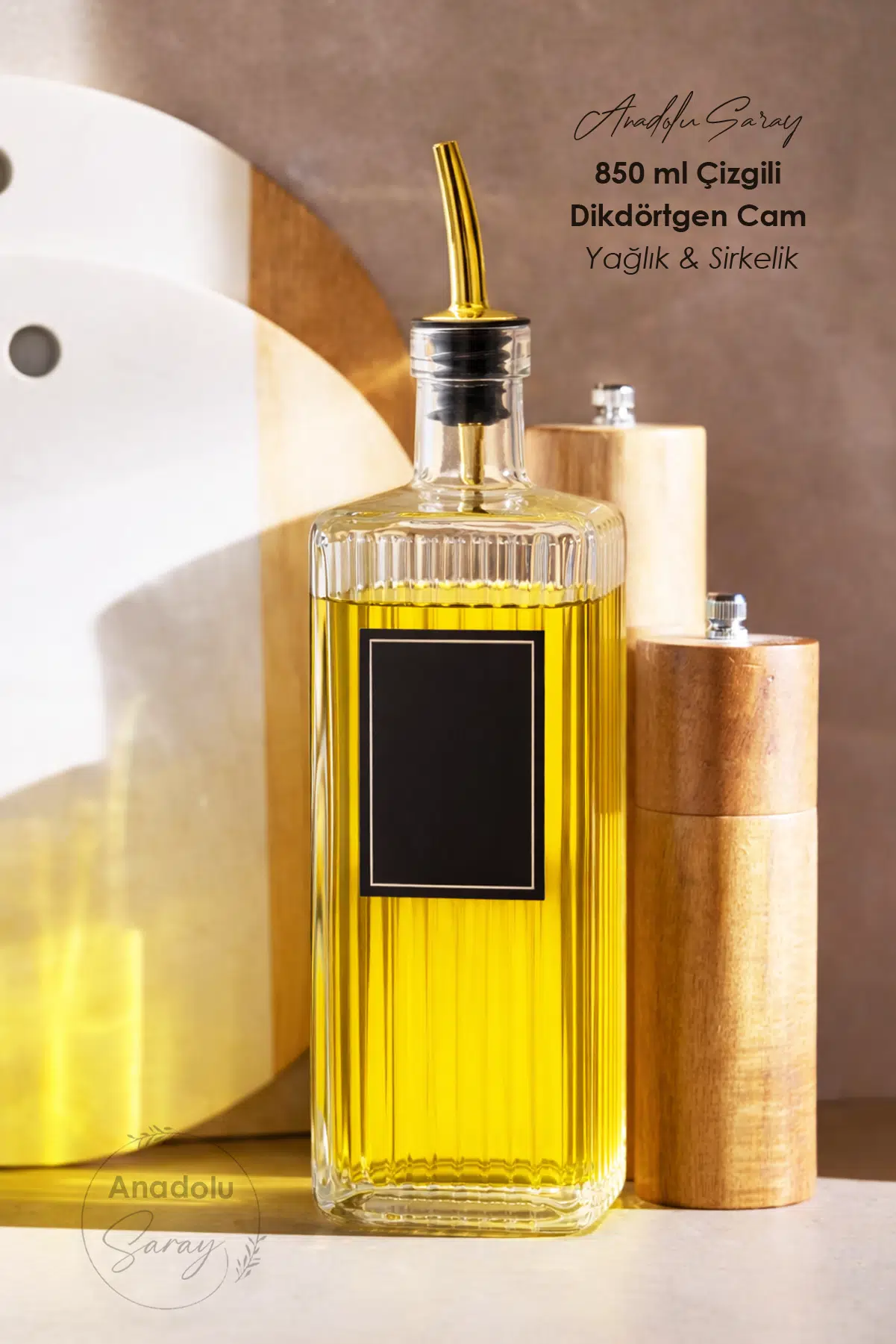 Şeffaf ve çizgili cam gövdesi sayesinde içindeki sıvıyı kolayca görebilir, mutfağınıza estetik bir dokunuş ekleyebilirsiniz.