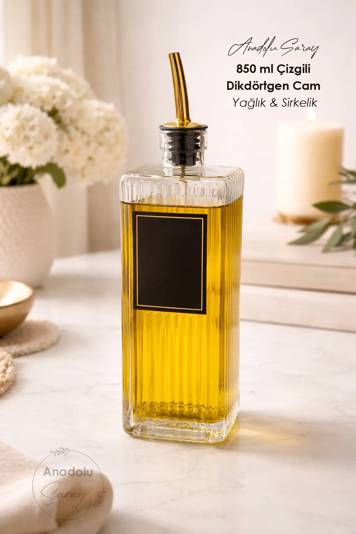 Yüksek kaliteli kalın cam malzemeden üretilmiş olup, yağ, sirke, sos, limon suyu ve benzeri sıvılar için güvenle kullanılabilir. Damlatmaz özel yağlık kapağı, kontrollü dökme sağlar ve tezgâh üzerinde akma, sızdırma gibi sorunların önüne geçer. Bu sayede hem temiz hem de pratik bir kullanım sunar.