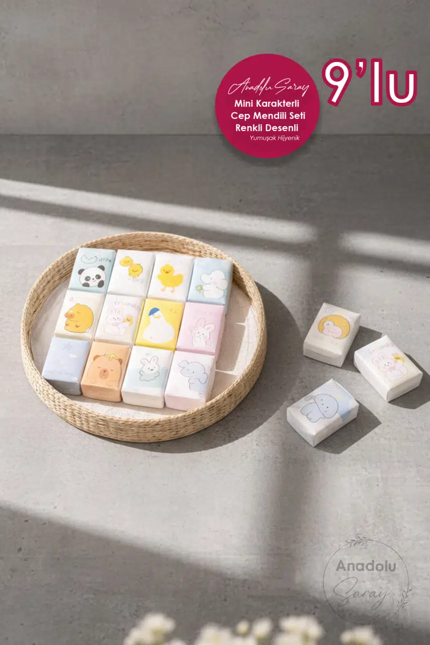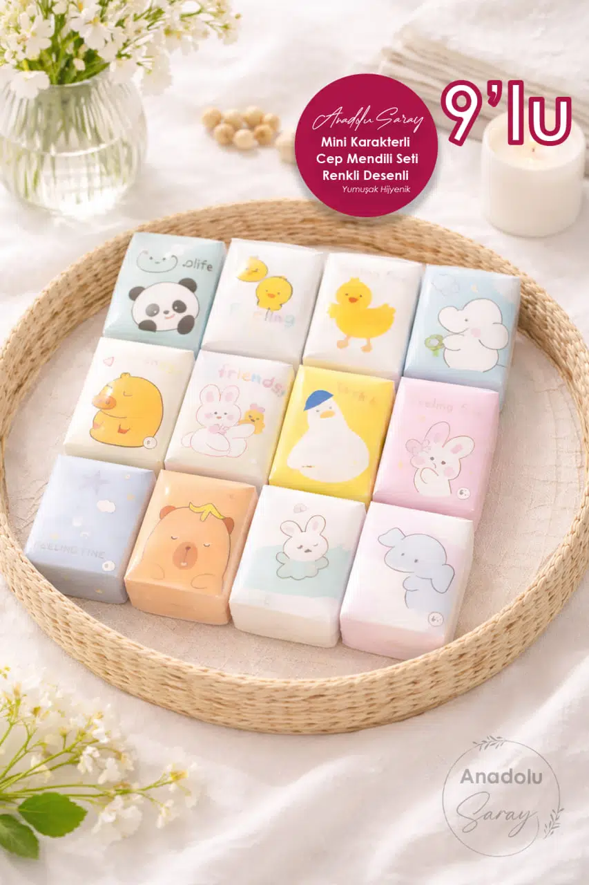 Günlük kullanımda hem pratik hem de sevimli bir çözüm arayanlar için tasarlanan 9 Paket Mini Karakterli Cep Mendili Seti, yumuşak dokusu ve eğlenceli desenleriyle öne çıkar.