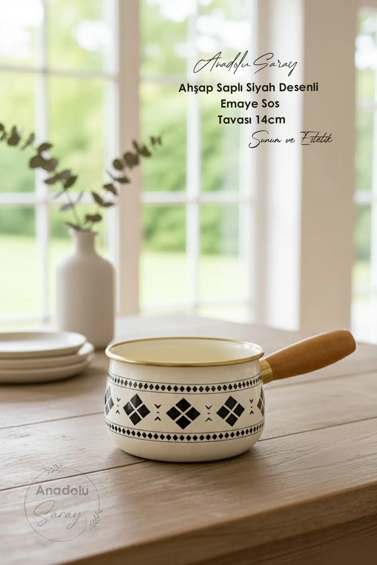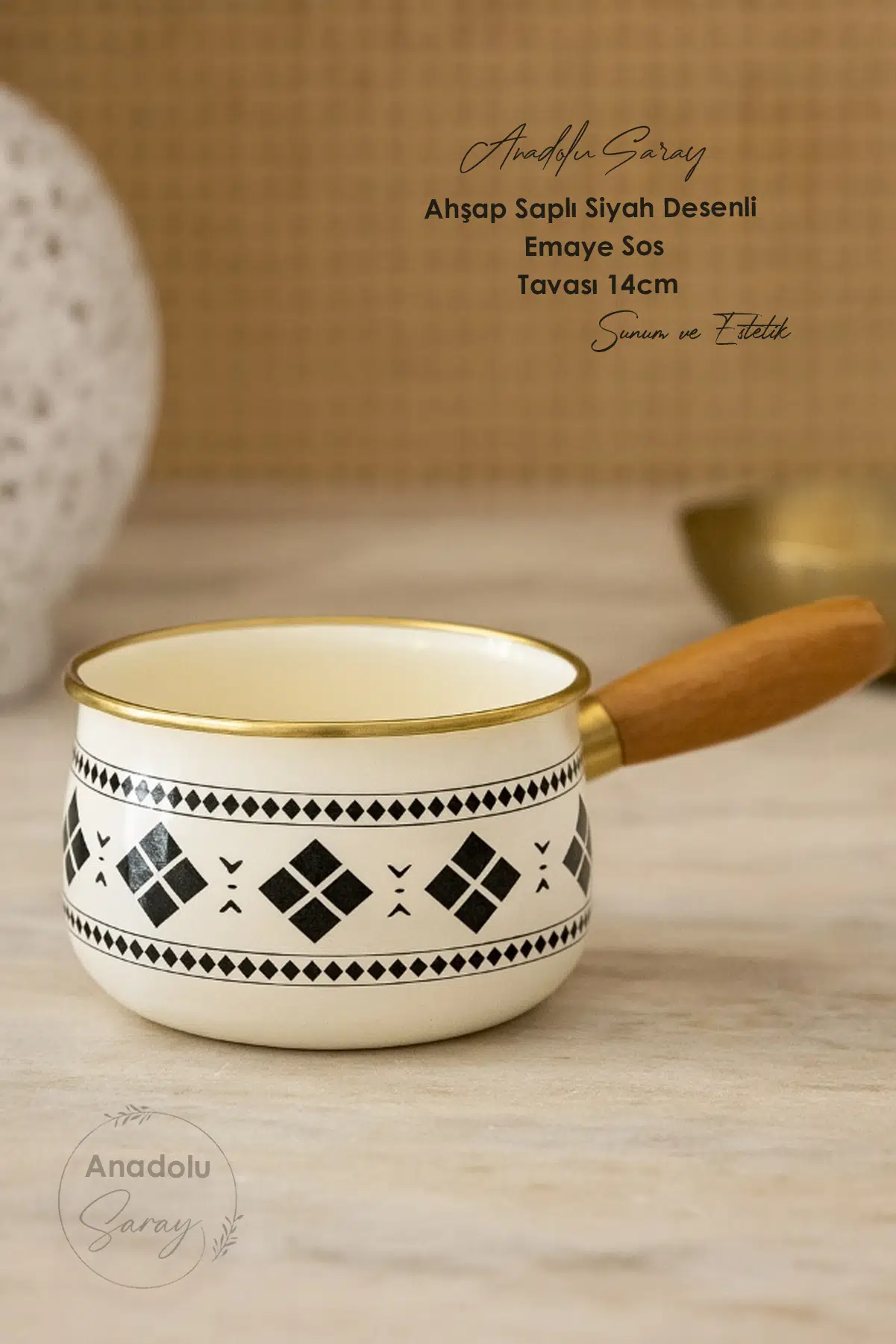 Ahşap Saplı Siyah Desenli Emaye Sos Tavası, mutfakta hem işlevselliği hem de estetik görünümü bir arada sunan şık bir üründür.