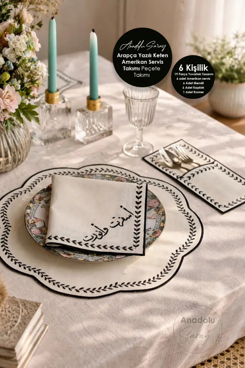 Sofra sunumlarınıza zarafet ve anlam katan Arapça yazılı keten Amerikan servis takımı, 6 kişilik özel içeriğiyle hem günlük kullanım hem de misafir sofraları için ideal bir seçimdir. Yuvarlak tasarımı sayesinde modern ve şık bir görünüm sunarak sofranıza estetik bir dokunuş kazandırır.