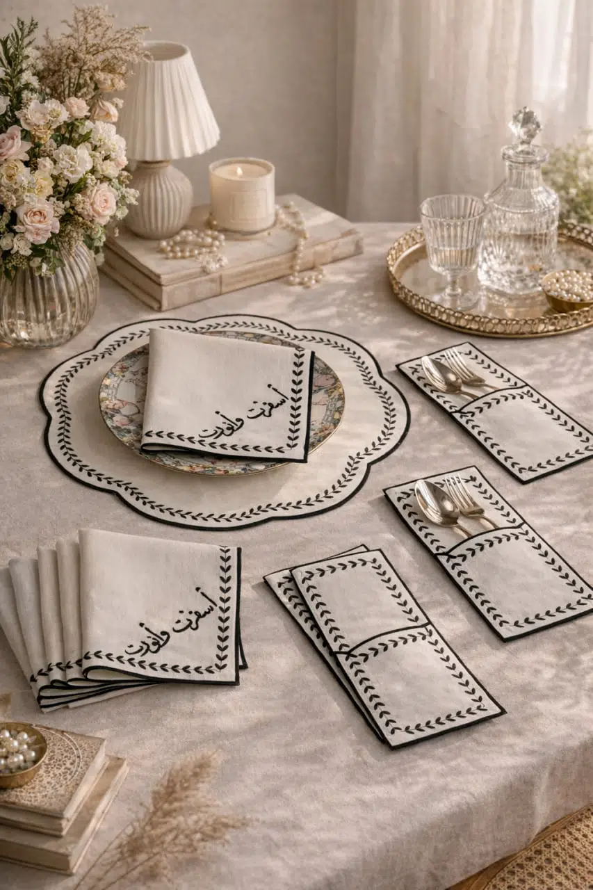Minimal, doğal ve estetik sofralar oluşturmak isteyenler için tasarlanan bu Arapça yazılı keten Amerikan servis takımı, hem görsel hem de anlam açısından sofralarınıza değer katar.