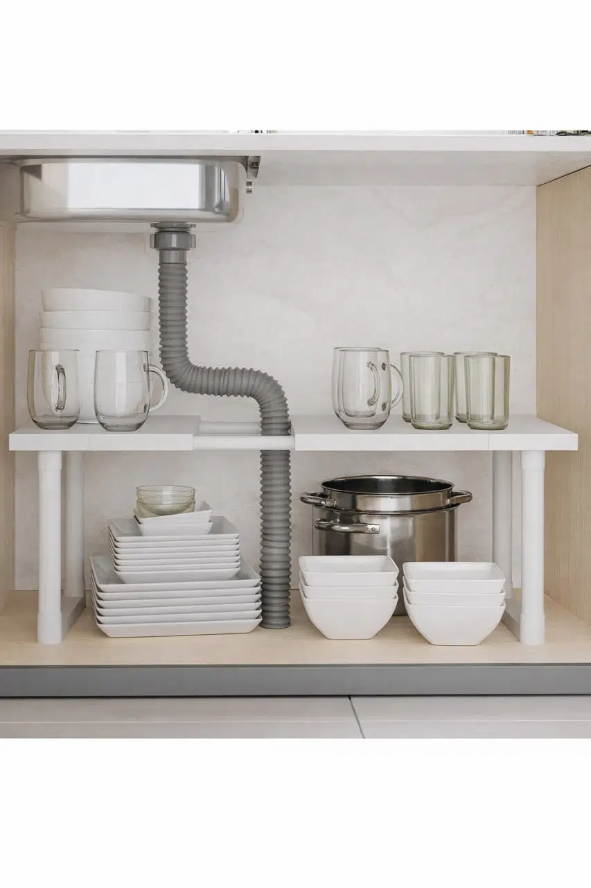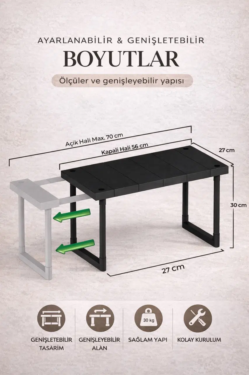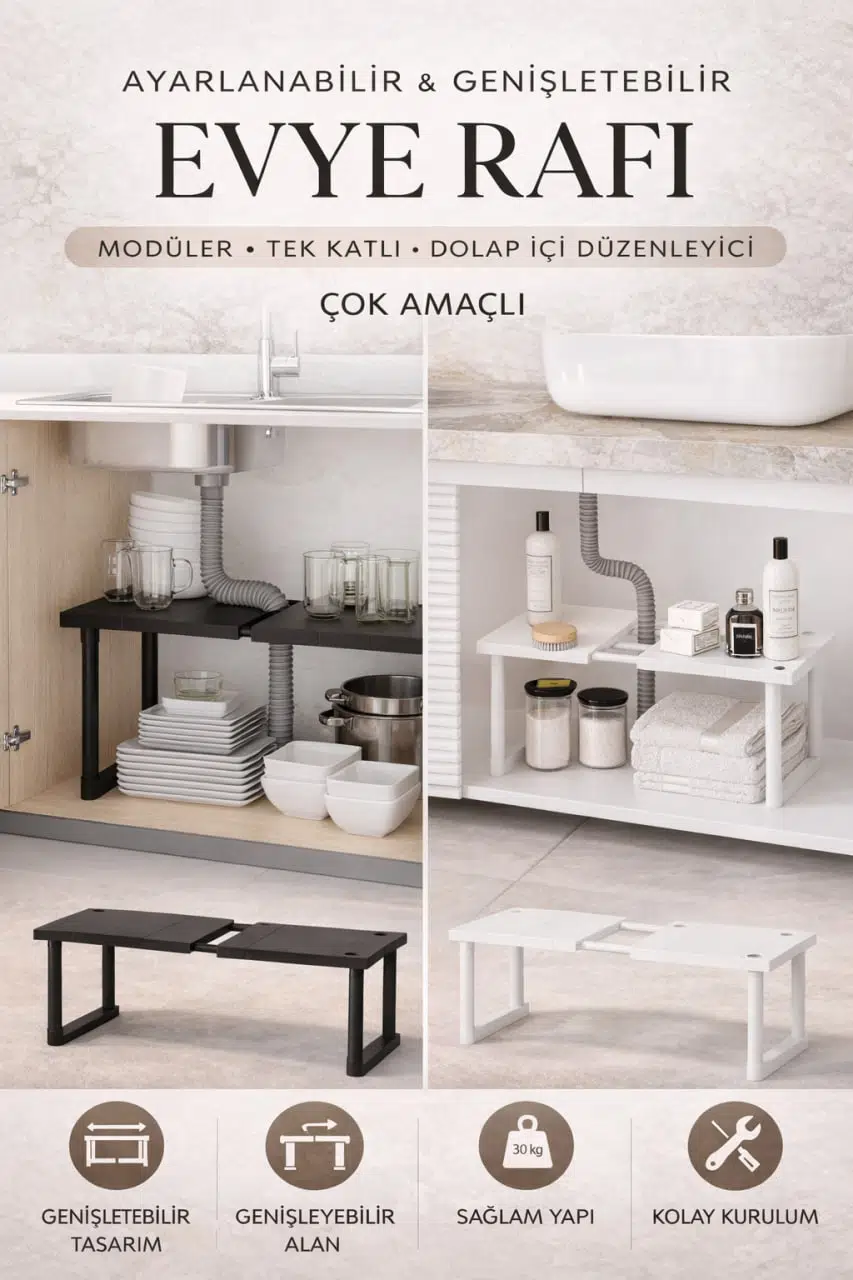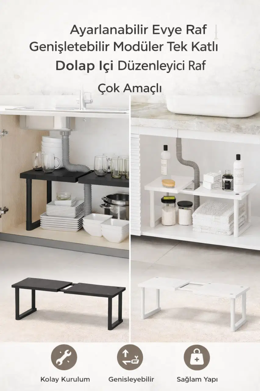 Genişletilebilir modüler tasarımı sayesinde farklı dolap ölçülerine uyum sağlar ve evye borularının etrafında kolay kullanım sunar.
