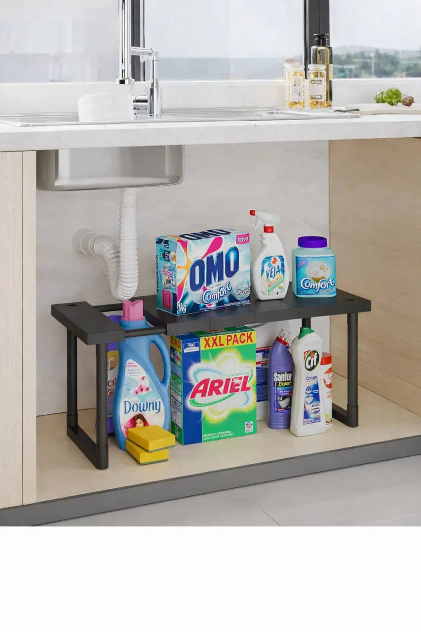 Mutfağınızda veya banyonuzda evye altındaki boş alanı maksimum verimle kullanmanızı sağlayan Ayarlanabilir Evye Altı Düzenleyici Raf, dolap içi depolama alanını genişletir ve dağınıklığı ortadan kaldırır.