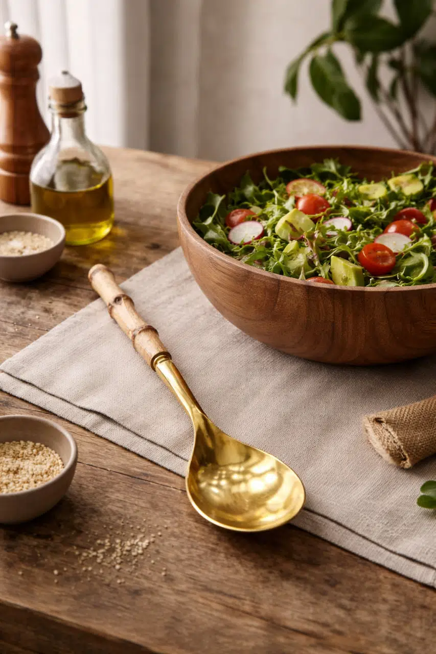 Doğal bambu sap detayı ve parlak gold kaplamasıyla tasarlanan bu şık salata servis kaşığı, sofralarınıza zarif ve modern bir dokunuş kazandırır. Rustik ve doğal masa konseptleriyle mükemmel uyum sağlayan tasarımı sayesinde hem günlük kullanımda hem de özel davet sofralarında estetik bir sunum sağlar.