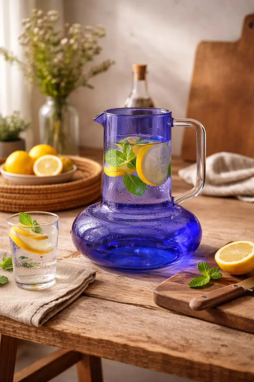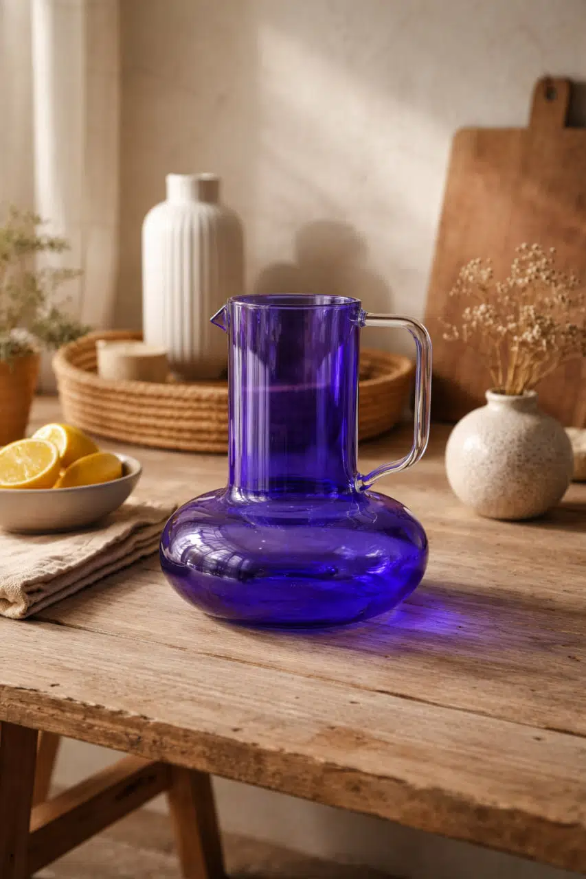 Modern mutfakların vazgeçilmezi olan mavi cam sürahi, şıklık ve fonksiyonelliği bir arada sunar.