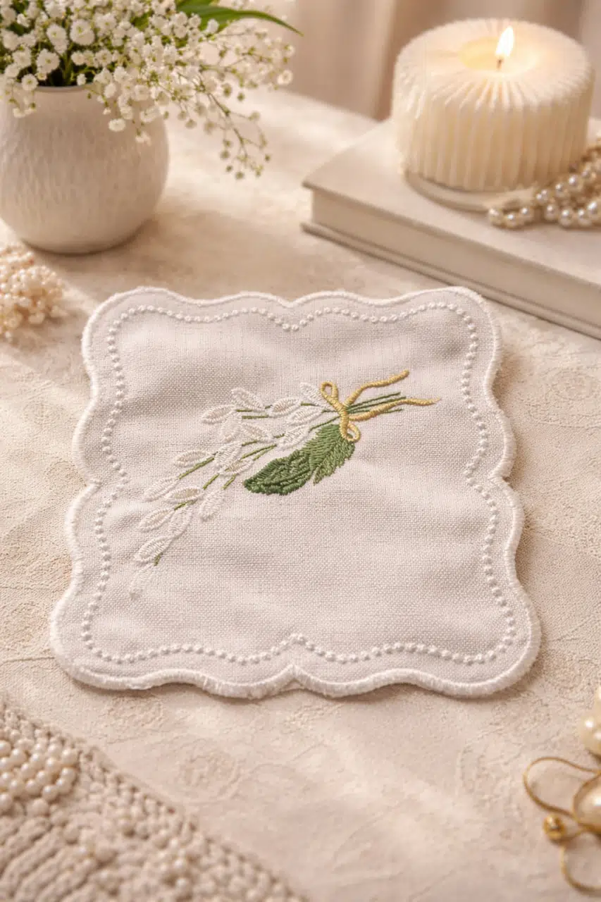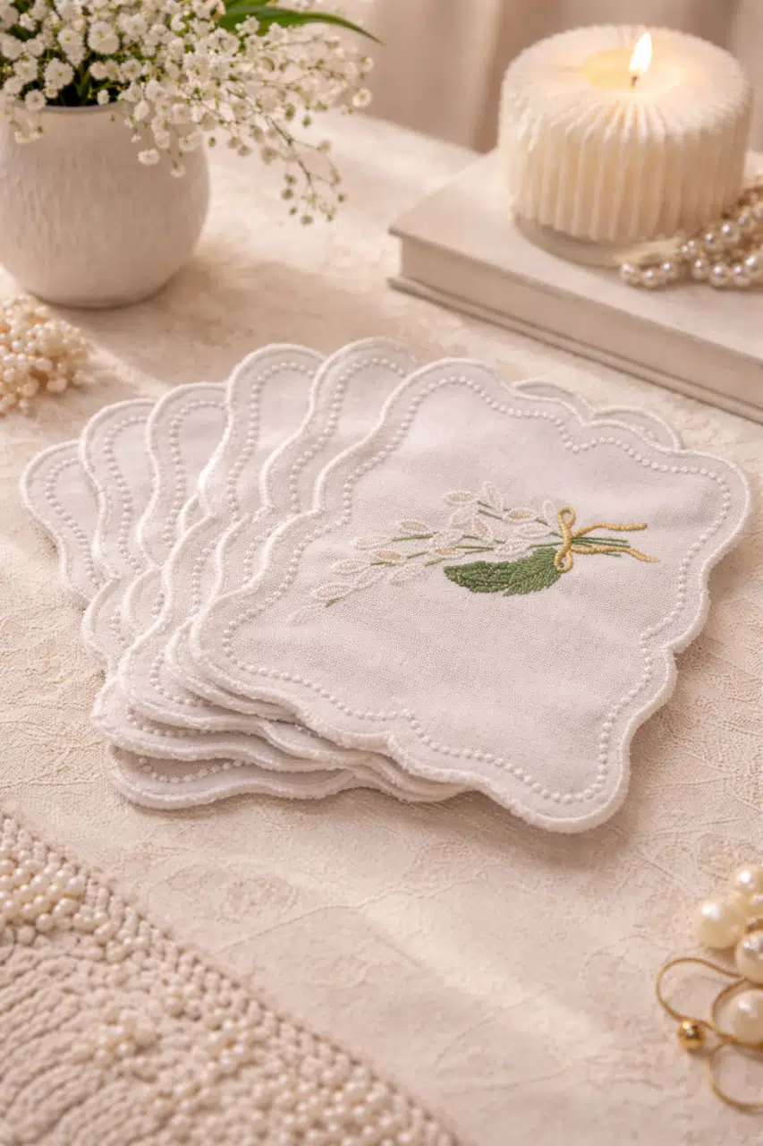 Doğal keten kumaştan üretilen bardak altlıkları, kenarlarında inci görünümlü nakış detayları ve zarif çiçek motifleriyle dikkat çeker. Yumuşak dokusu sayesinde bardak ve fincan yüzeylerini çizmeden korur, masa üzerinde iz oluşmasını engellemeye yardımcı olur.