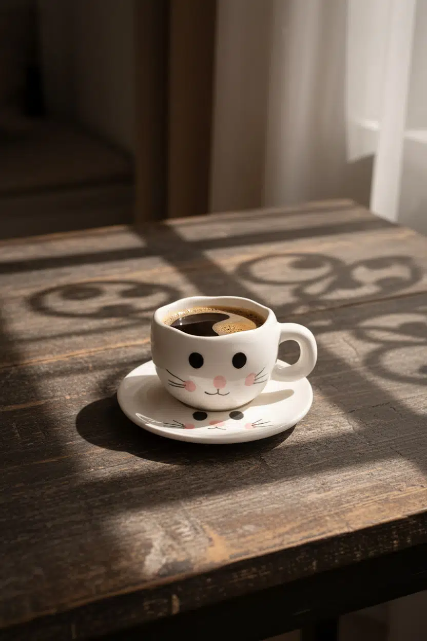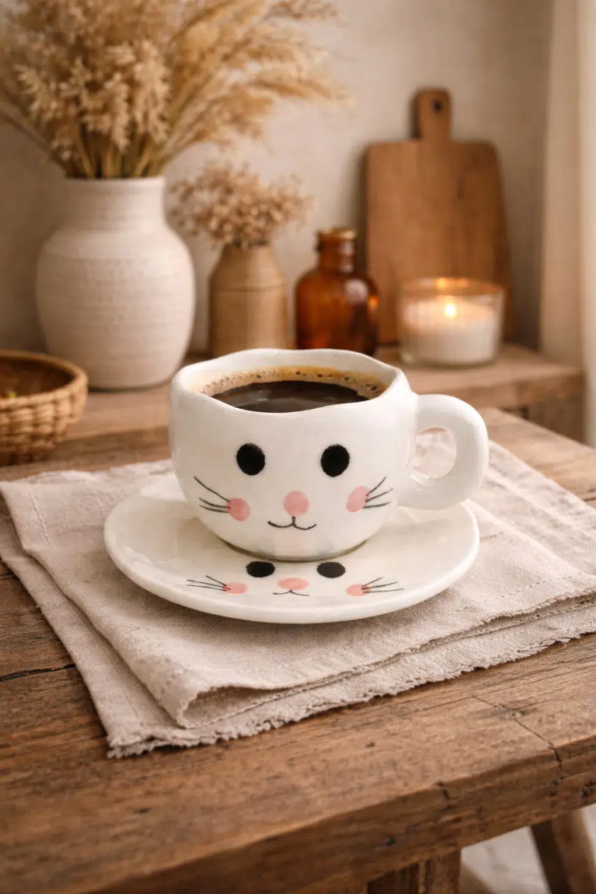 Sıcak içecek keyfinizi daha özel ve estetik hale getiren el yapımı kedi figürlü seramik kahve fincanı ve tabak seti, hem günlük kullanım hem de dekoratif sunumlar için ideal bir tercihtir.