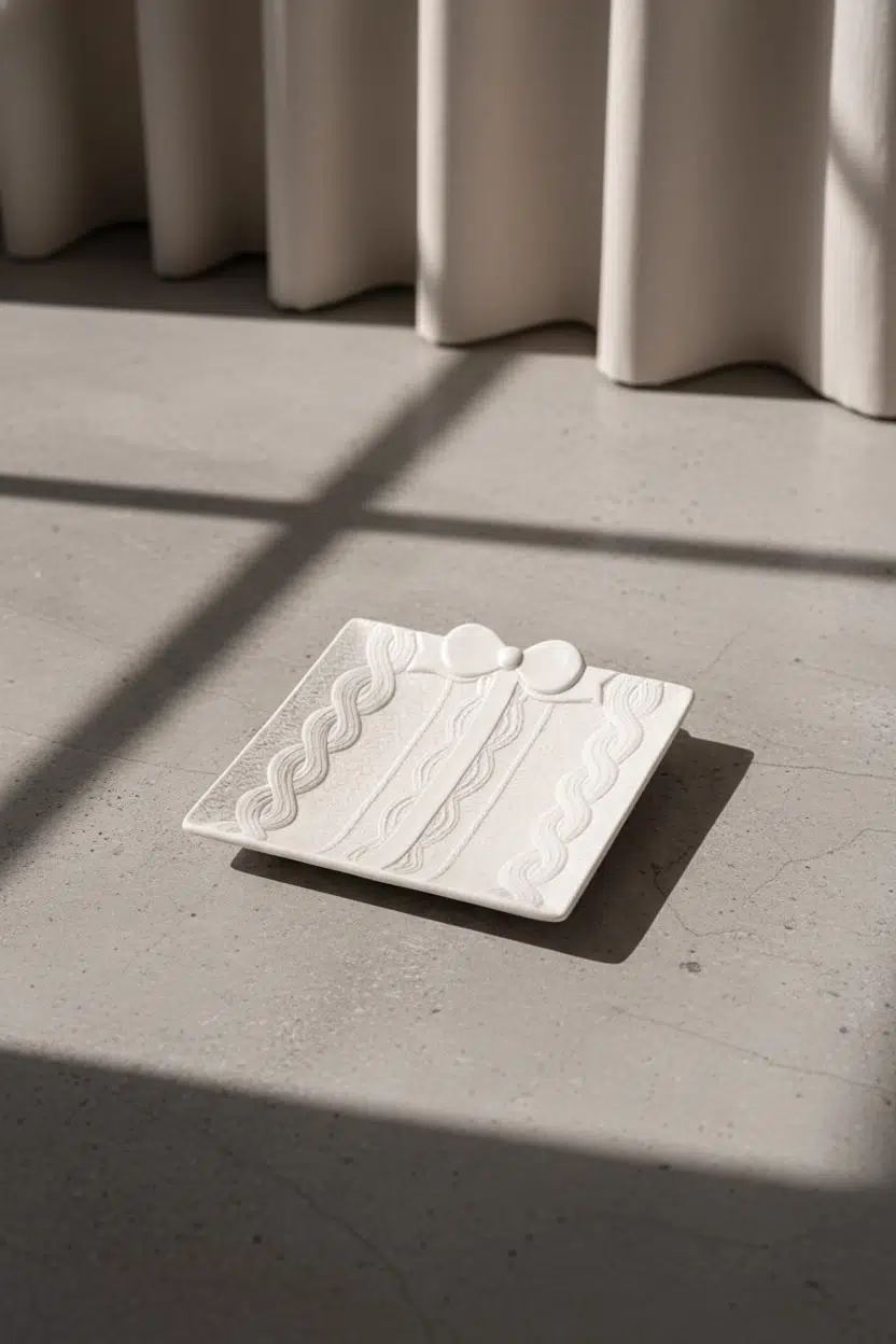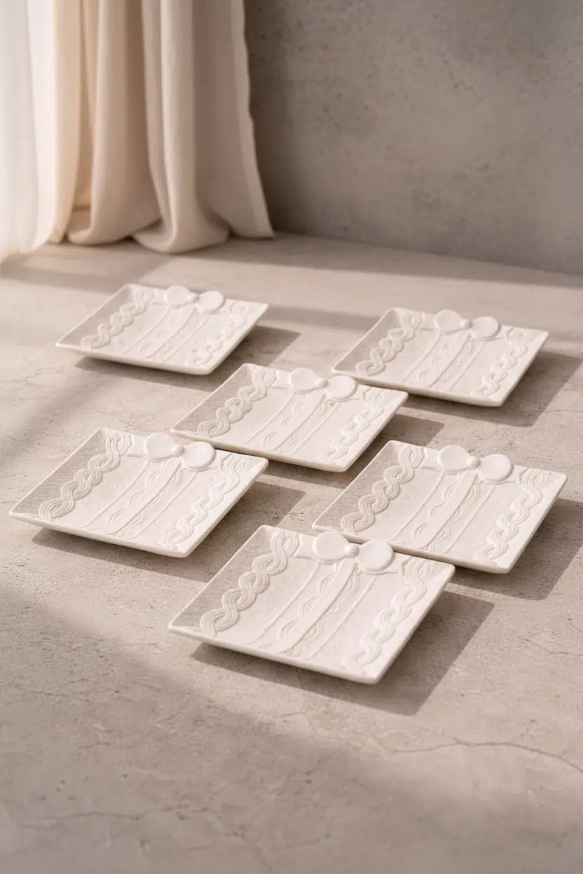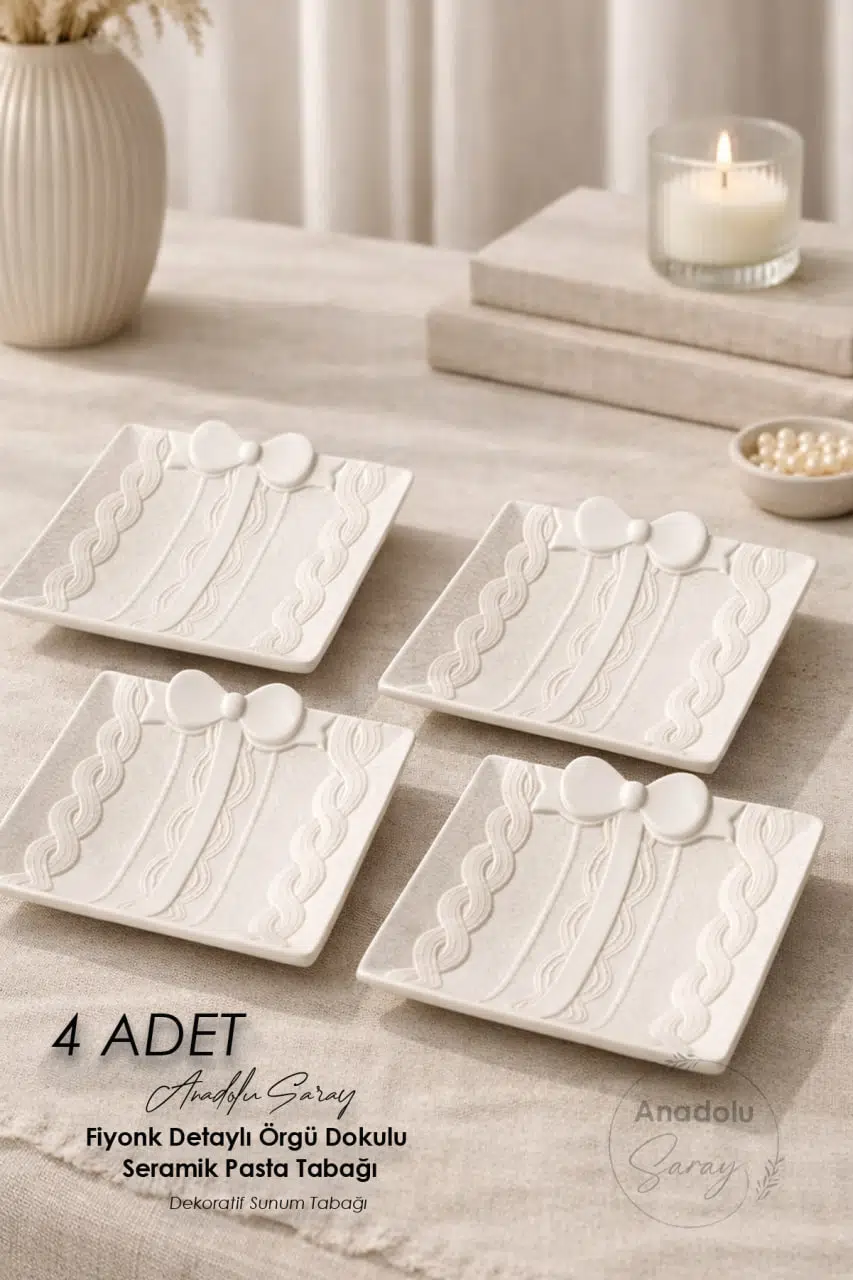 Zarif detayları ve modern tasarımıyla öne çıkan fiyonk detaylı örgü dokulu seramik pasta tabağı, sofralarınıza estetik bir dokunuş kazandırır. Örgü dokulu yüzeyi ve minimal fiyonk detayı sayesinde hem klasik hem modern masa düzenleriyle uyum sağlar.