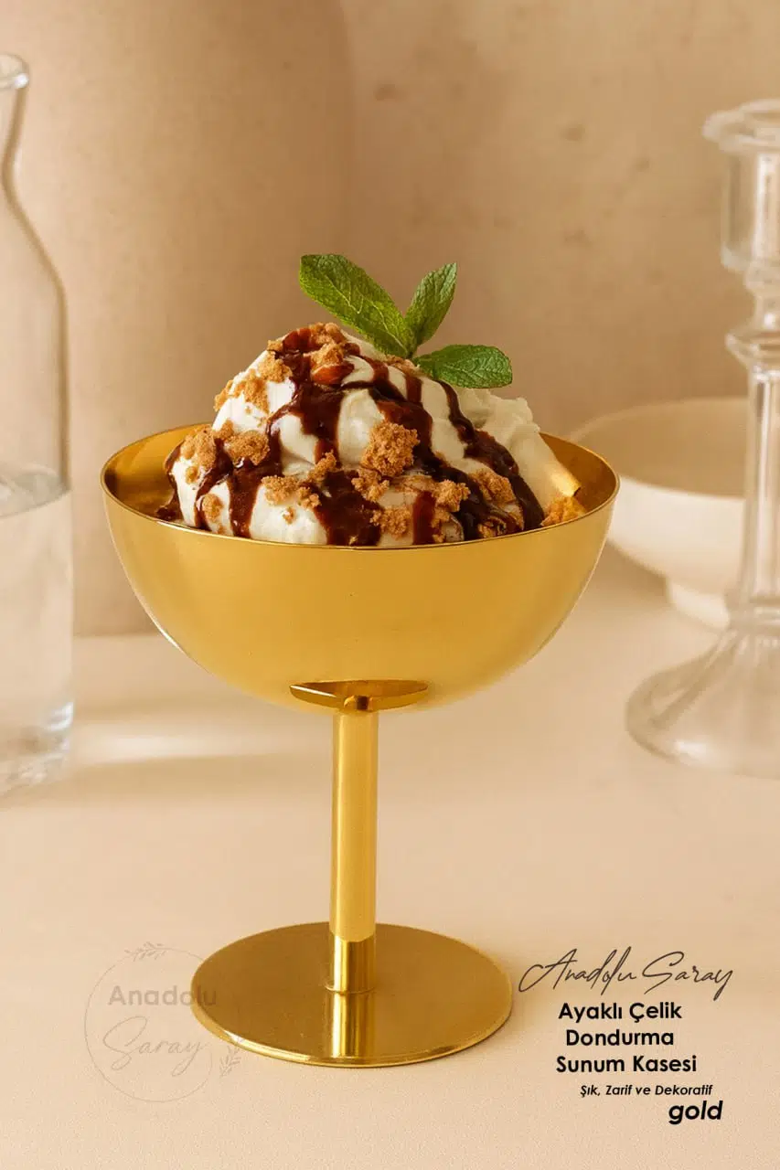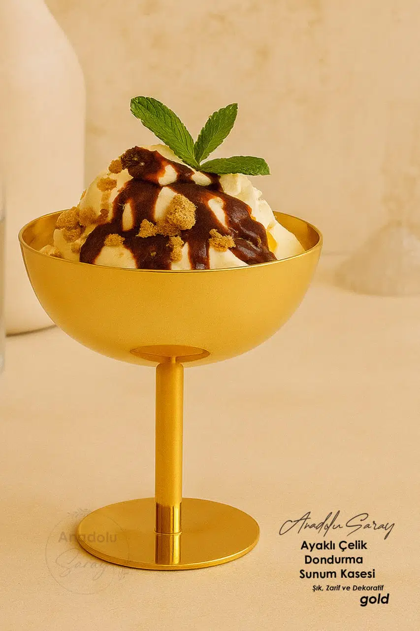 Sofralarınıza zarafet ve şıklık katacak Gold Ayaklı Çelik Dondurma ve Sunum Kasesi, modern tasarımı ve yüksek kaliteli paslanmaz çelik yapısıyla hem kullanışlı hem de estetik bir sunum deneyimi sunar.